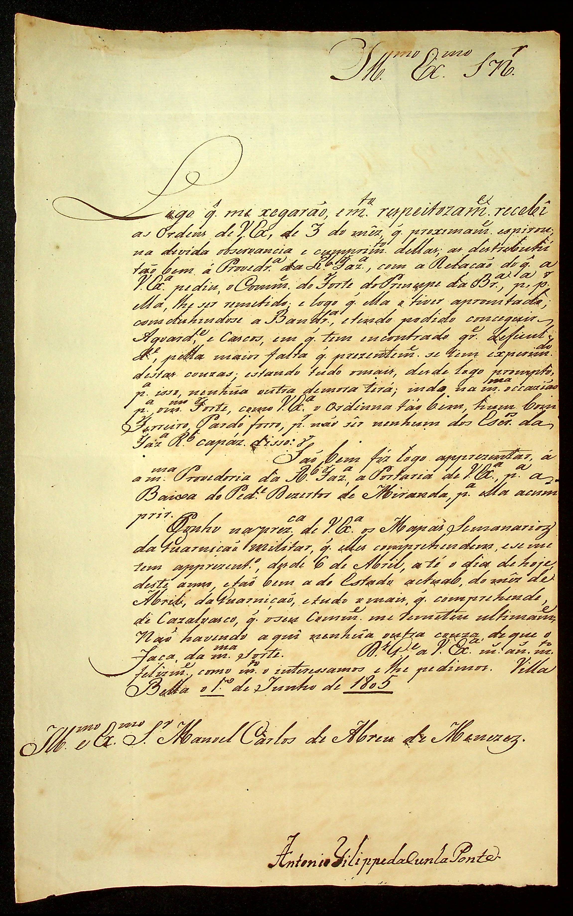 CARTA do [Coronel] Antônio Felipe Ponte ao [Governador e Capitão-General da Capitania de Mato Grosso] Manoel Carlos de Abreu e Menezes.