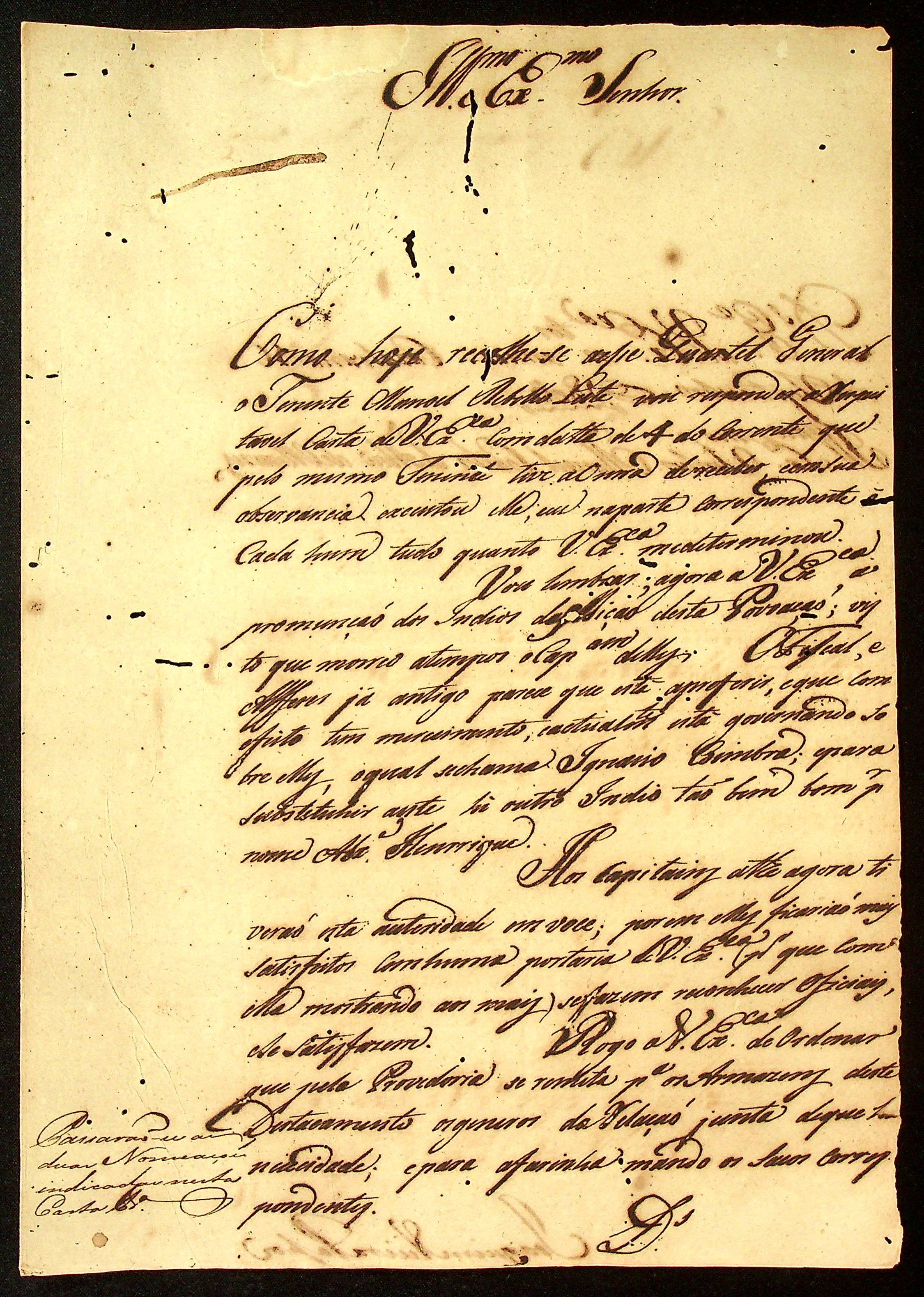 CARTA do Alferes Comandante Joaquim Vieira Passos ao [Governador e Capitão-General da Capitania de Mato Grosso] Manoel Carlos de Abreu e Menezes.