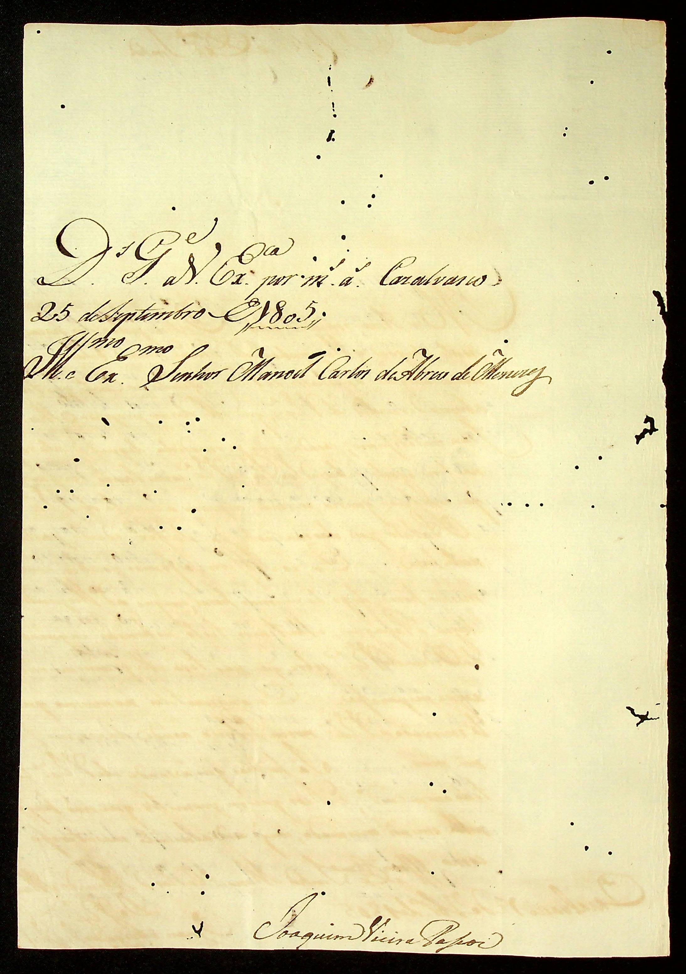 CARTA do [Alferes e Comandante] Joaquim Vieira Passos ao [Governador e Capitão-General da Capitania de Mato Grosso] Manoel Carlos de Abreu e Menezes.