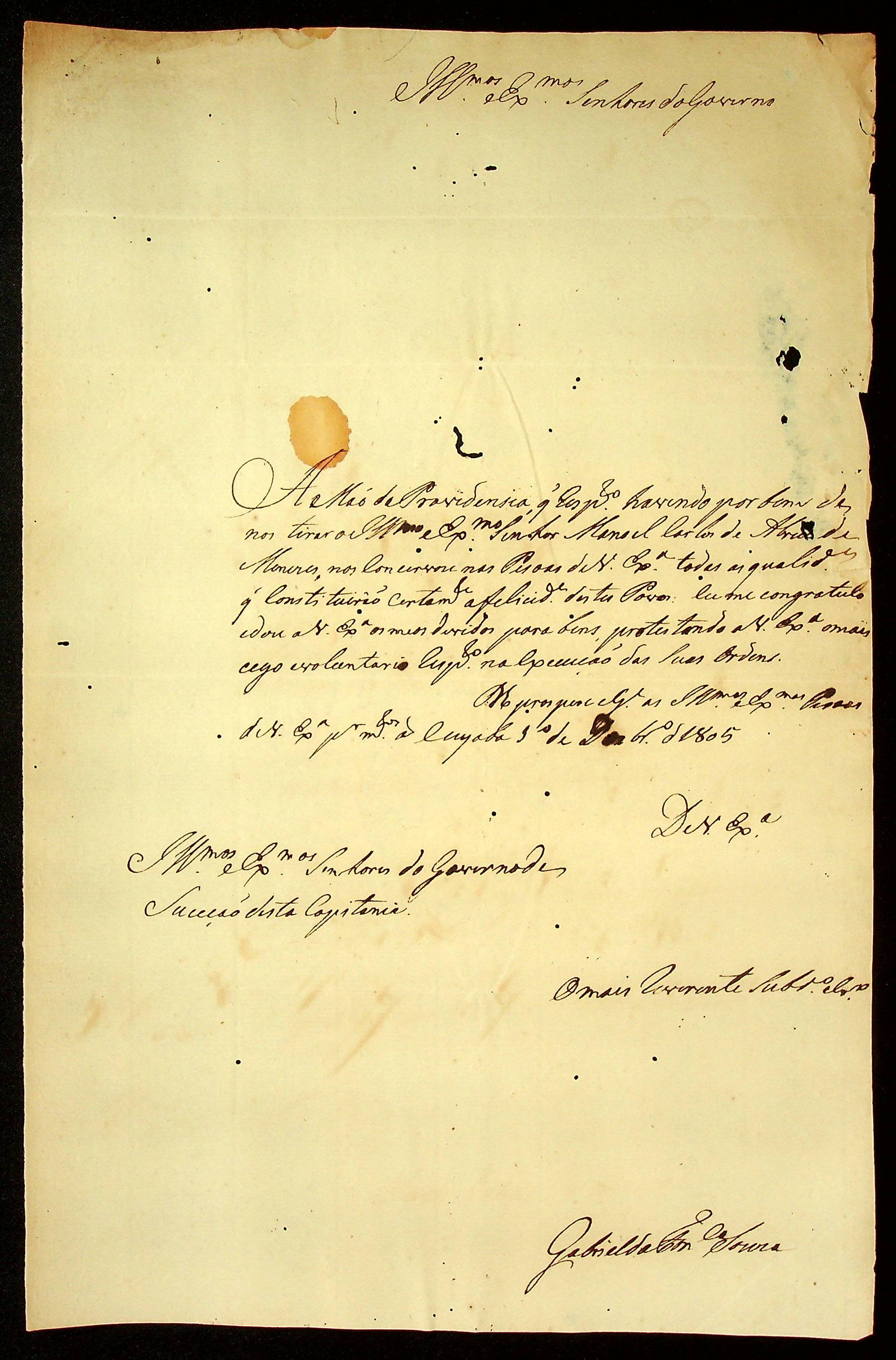 CARTA do [Tenente-Coronel] Gabriel da Fonseca Souza à Terceira Junta Governativa da Capitania de Mato Grosso.