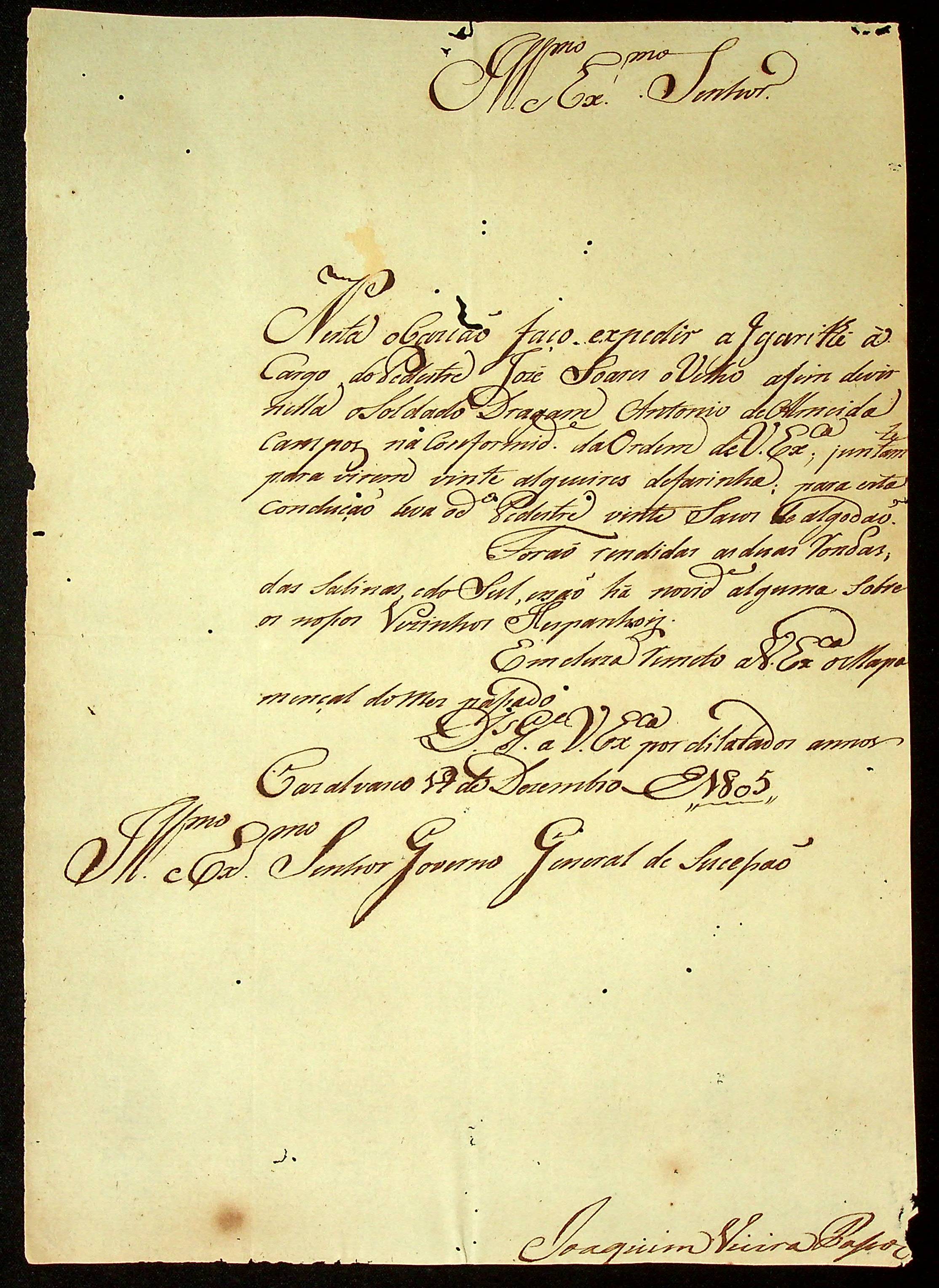 CARTA do Alferes Comandante Joaquim Vieira Passos ao [Governador e Capitão-General da Capitania de Mato Grosso] Manoel Carlos de Abreu e Menezes.