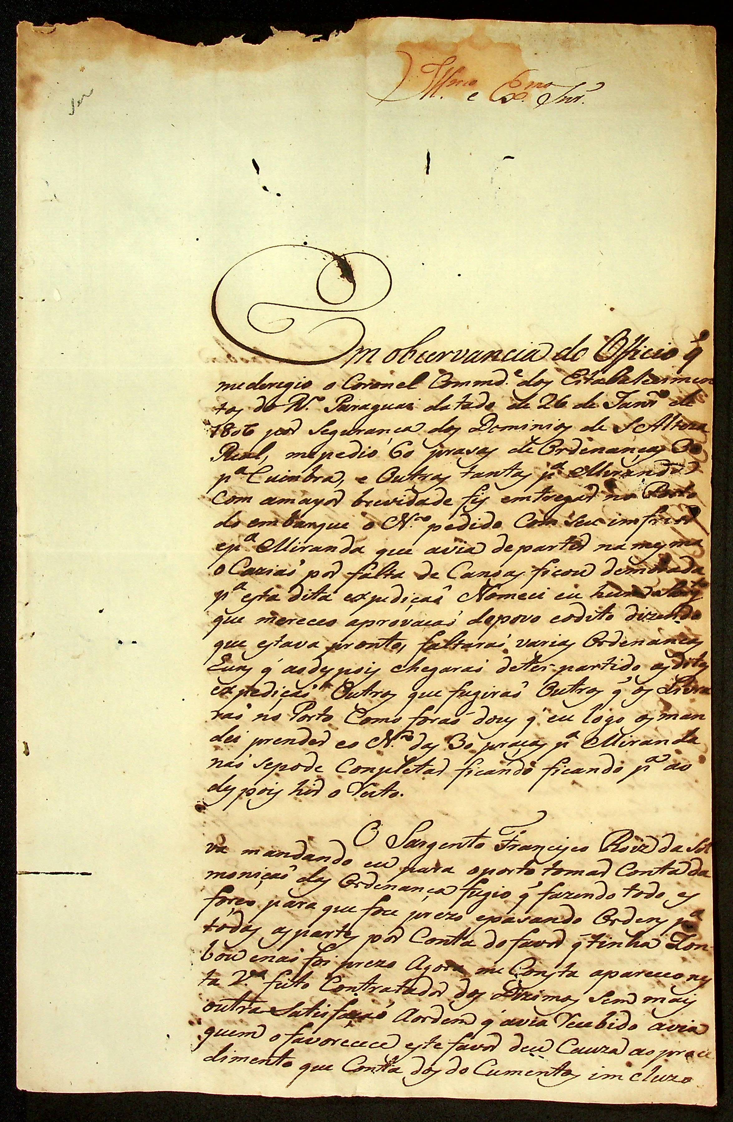 CARTA do Capitão-mor das Ordenanças Antônio Luiz da Rocha à [Terceira Junta Governativa da Capitania de Mato Grosso].