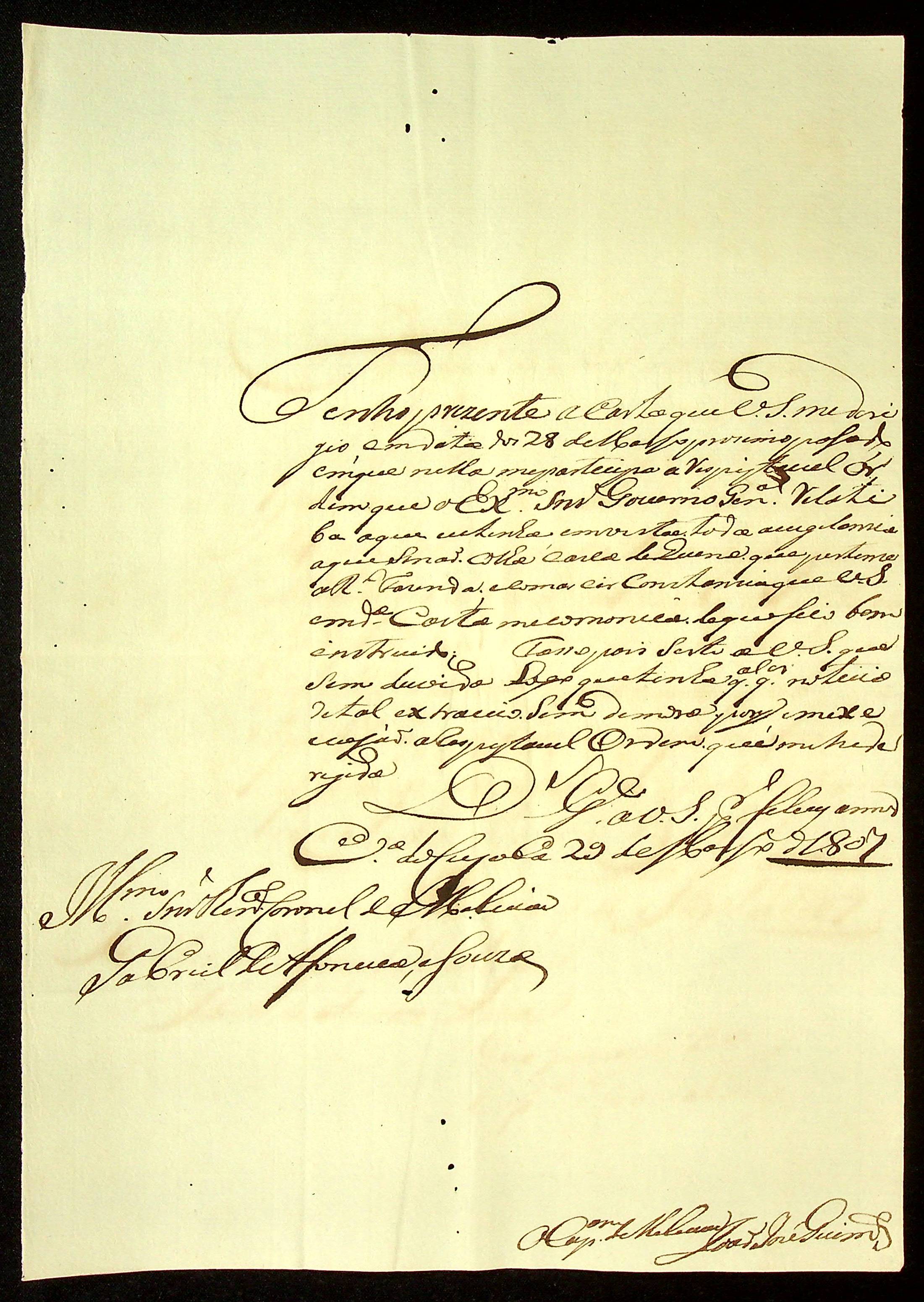 CARTA do Tenente e Comandante Geral Coronel Gabriel da Fonseca Souza à [Terceira Junta Governativa da Capitania de Mato Grosso].