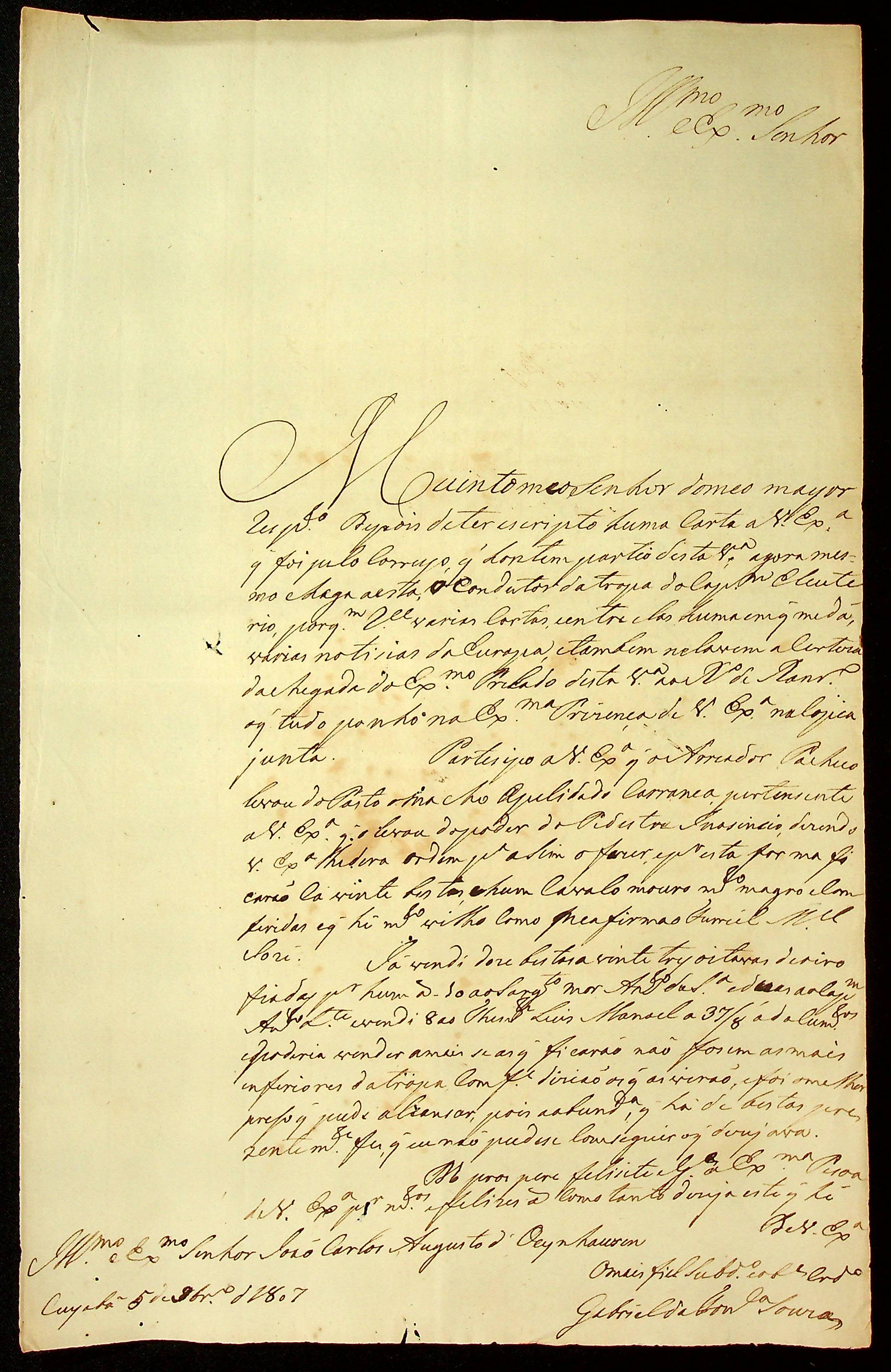 CARTA do [Tenente-Coronel] Gabriel da Fonseca Souza ao [Governador e Capitão-General da Capitania de Mato Grosso João Carlos Augusto d’Oeynhausen e Gravenberg].