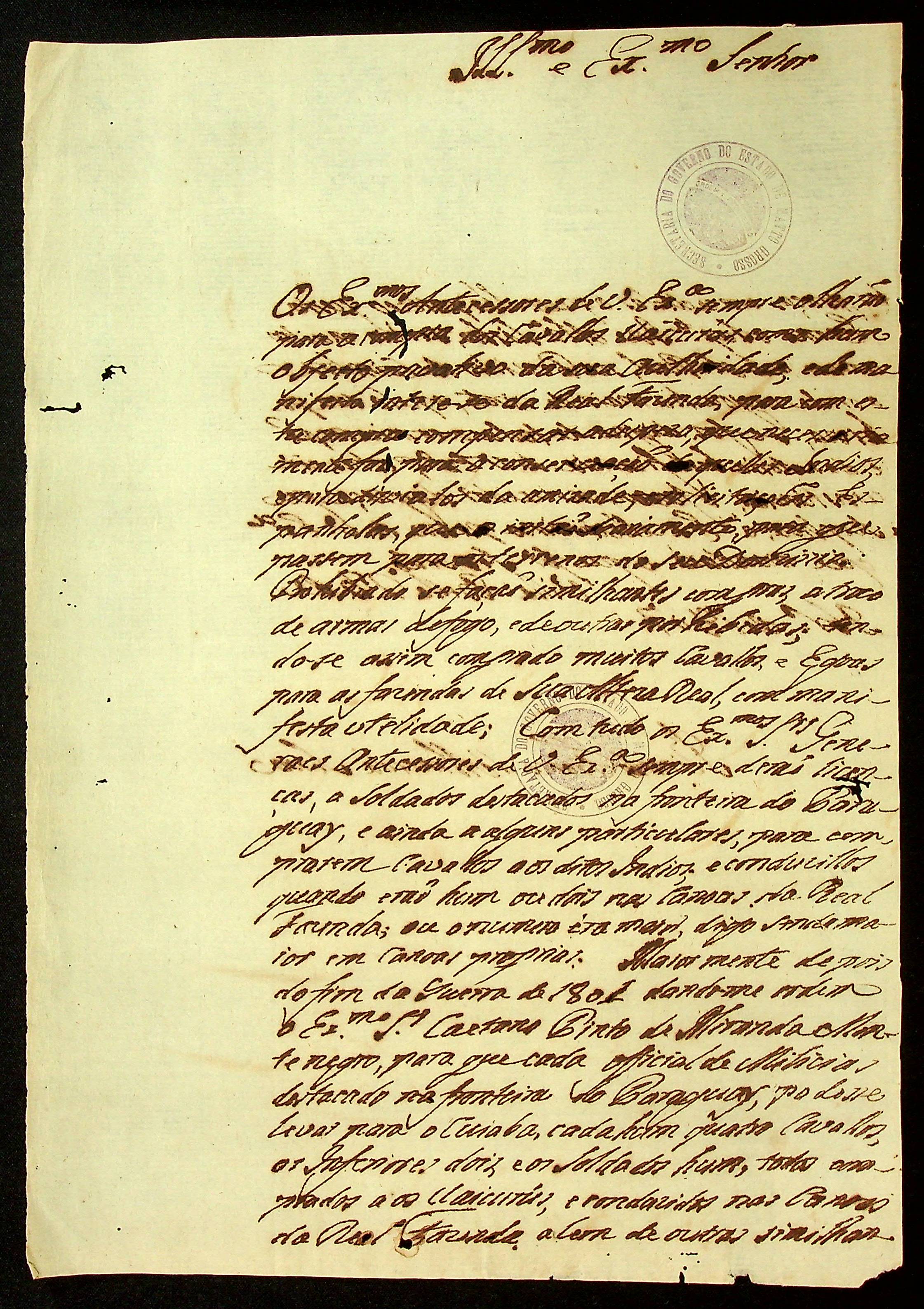 CARTA do [Coronel] Ricardo Franco de Almeida Serra ao [Governador e Capitão-General da Capitania de Mato Grosso João Carlos Augusto d’Oeynhausen e Gravenberg].