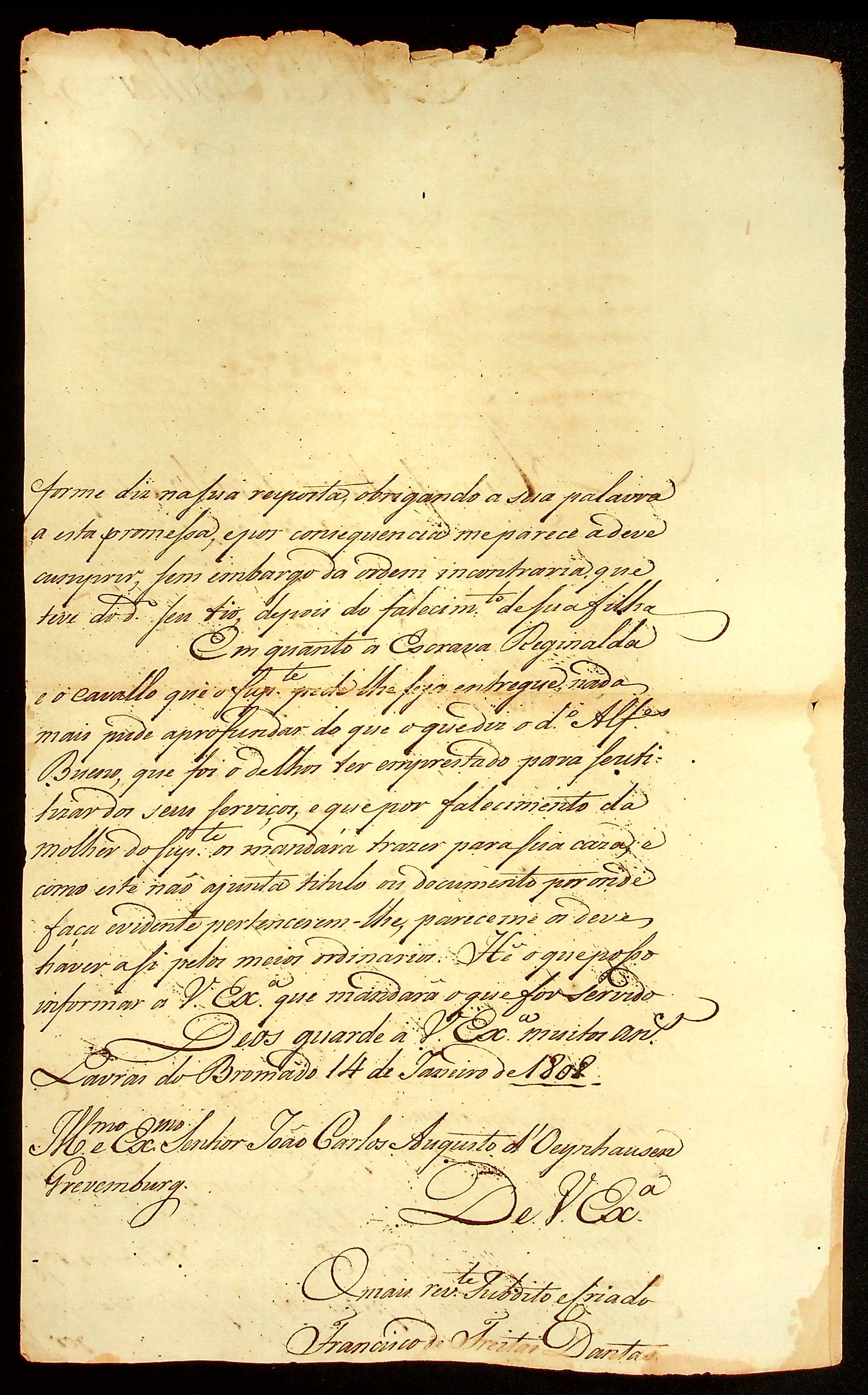 CARTA do Capitão Francisco de Freitas Dantas ao [Governador e Capitão-General da Capitania de Mato Grosso João Carlos Augusto d’Oeynhausen e Gravenberg].
