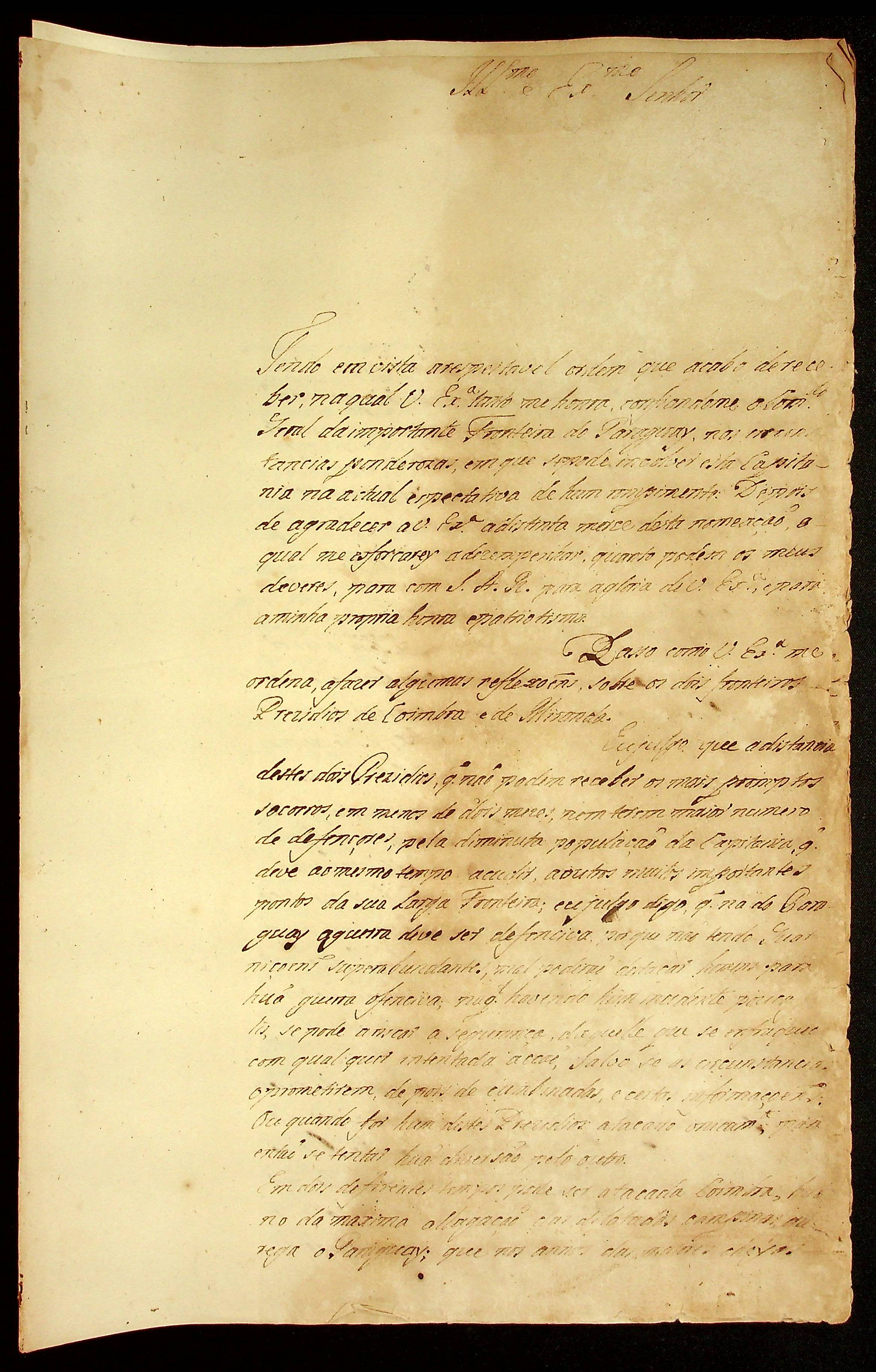 CARTA do [Coronel] Ricardo Franco de Almeida Serra ao [Governador e Capitão-General da Capitania de Mato Grosso] João Carlos Augusto d’Oeynhausen e Gravenberg.