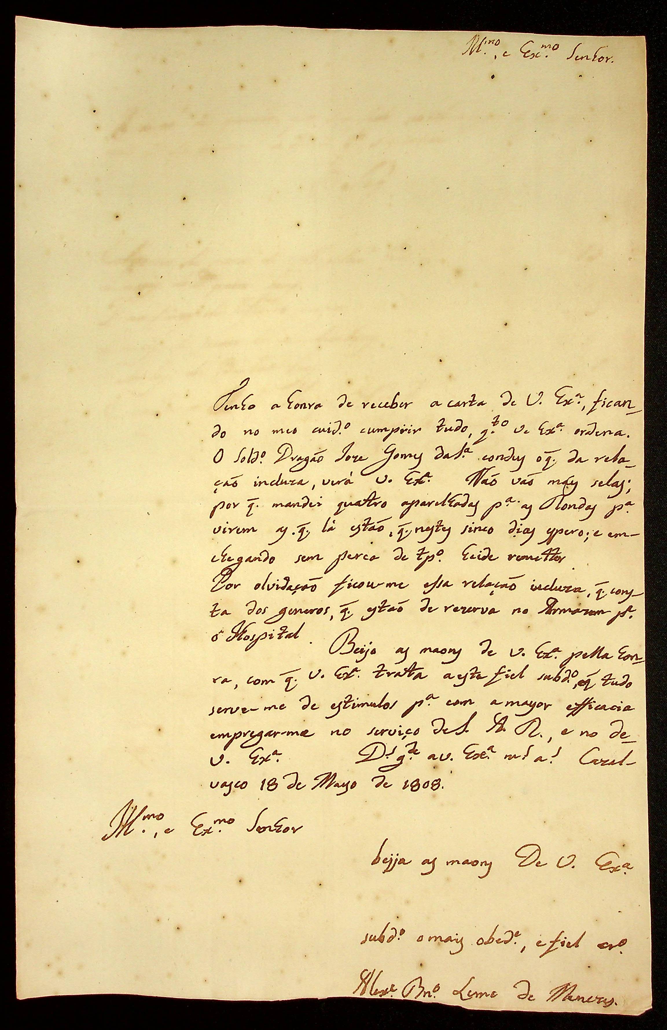CARTA de Alexandre Brito Leme de Meneses ao [Governador e Capitão-General da Capitania de Mato Grosso João Carlos Augusto d’Oeynhausen e Gravenberg].