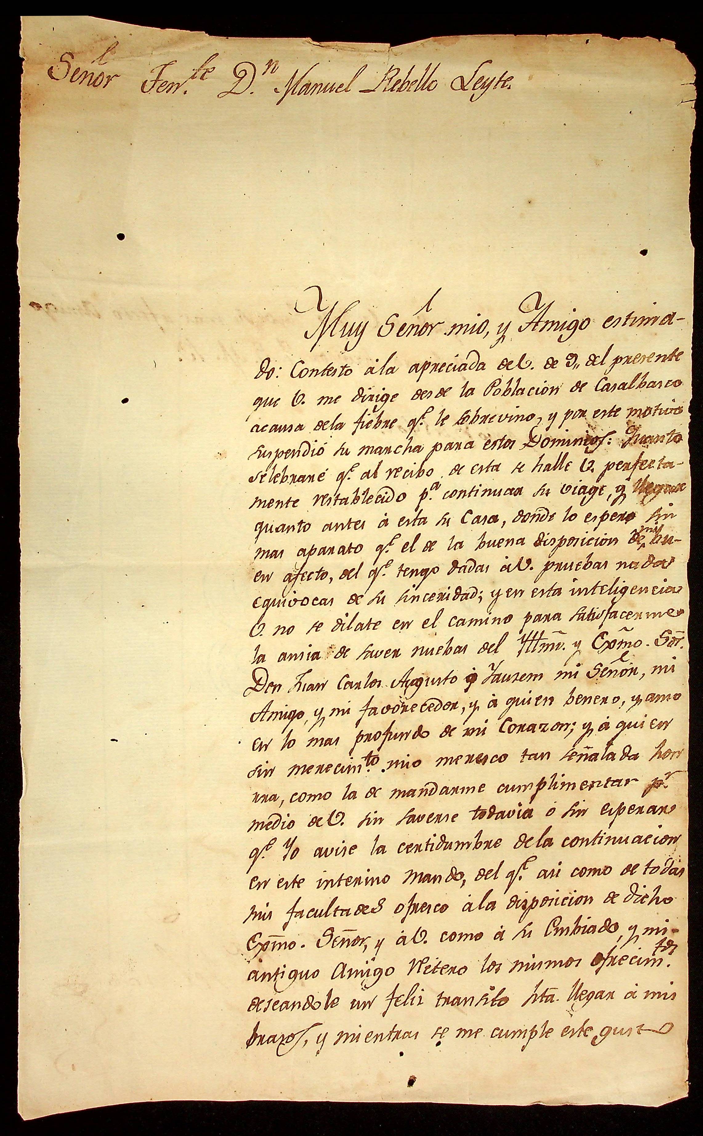 CARTA de Francisco Xavier Velasco ao Tenente Manoel [Rabelo] Leite.