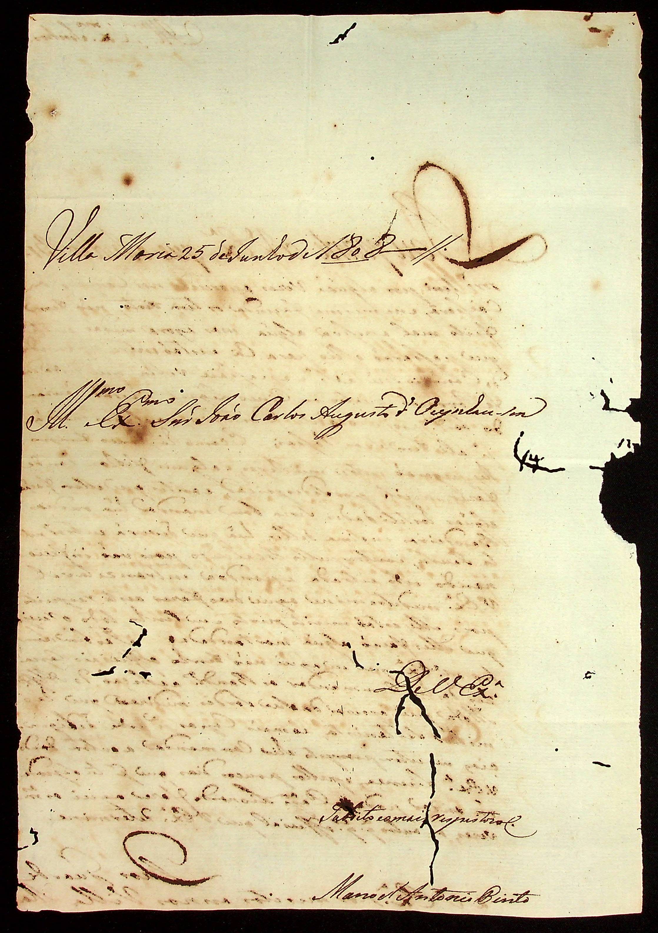 CARTA do [Comandante de Vila Maria [Manoel Antônio Pinto ao [Governador e Capitão-General da Capitania de Mato Grosso [João Carlos Augusto d’Oeynhausen e Gravenberg.