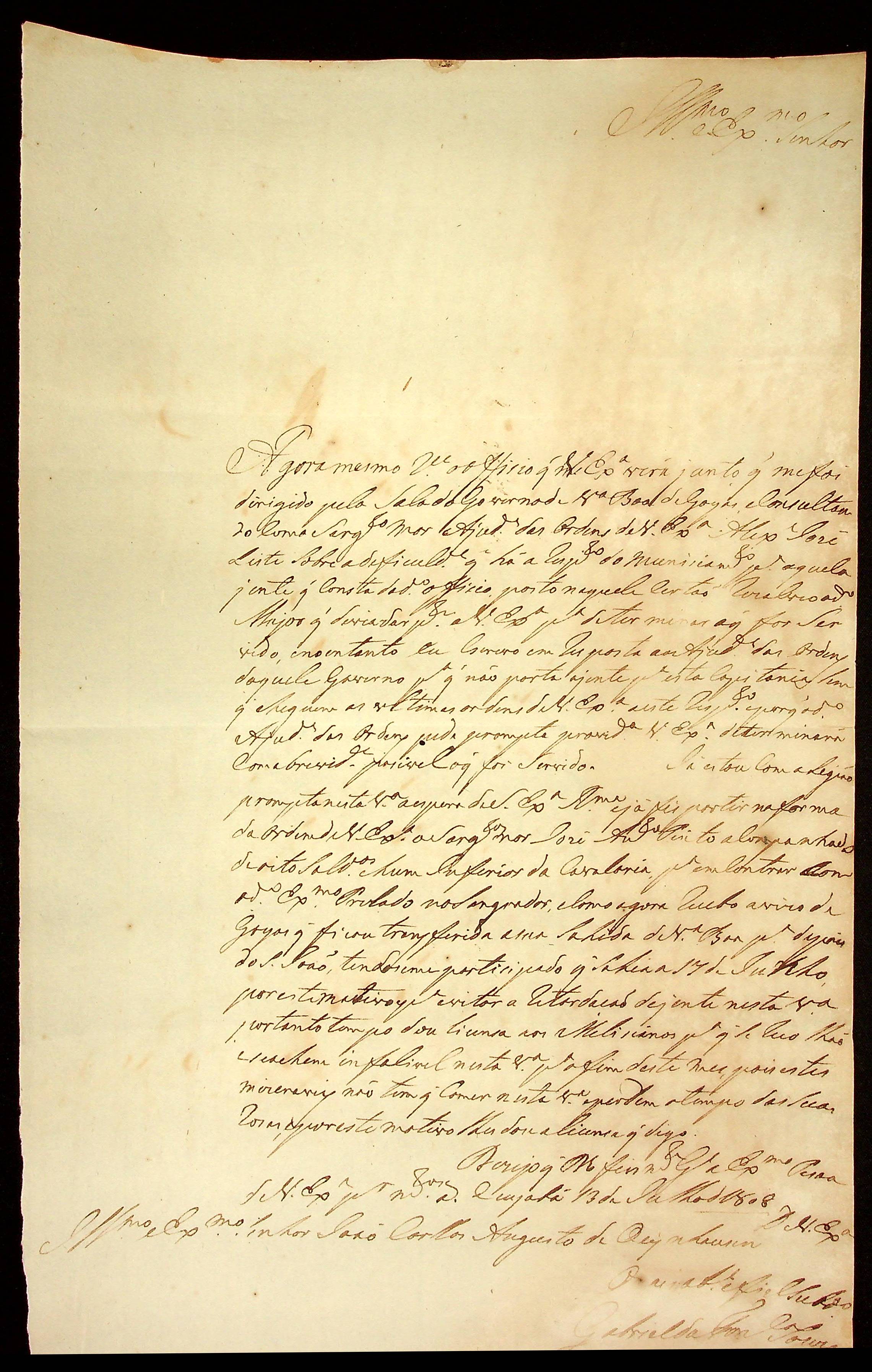 CARTA do [Tenente-Coronel da Legião de Milícias] Gabriel de Fonseca Souza ao [Governador e Capitão-General da Capitania de Mato Grosso] João Carlos Augusto d’Oeynhausen e Gravenberg.