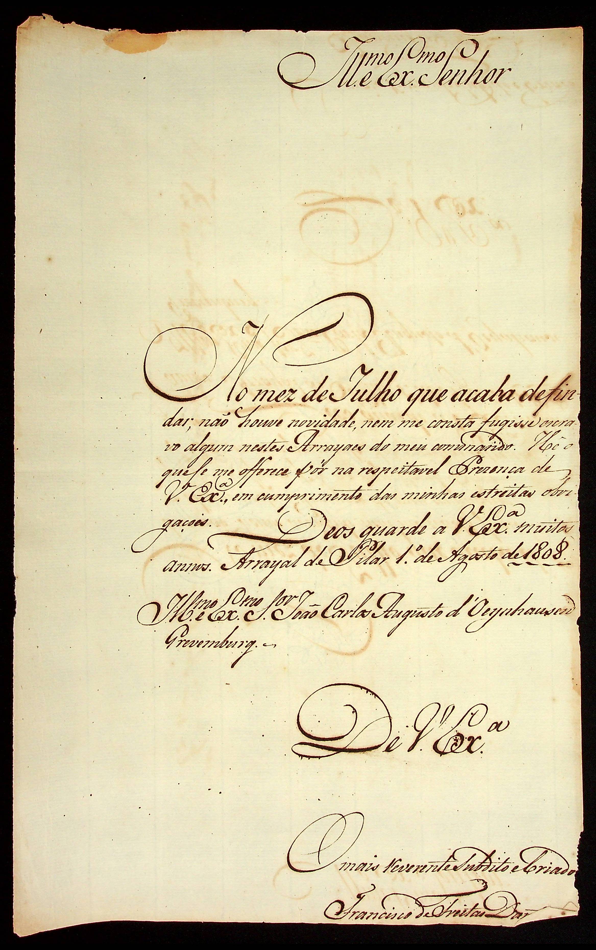 CARTA do [Capitão] Francisco de Freitas Dantas ao [Governador e Capitão-General da Capitania de Mato Grosso] João Carlos Augusto d’Oeynhausen e Gravenberg.