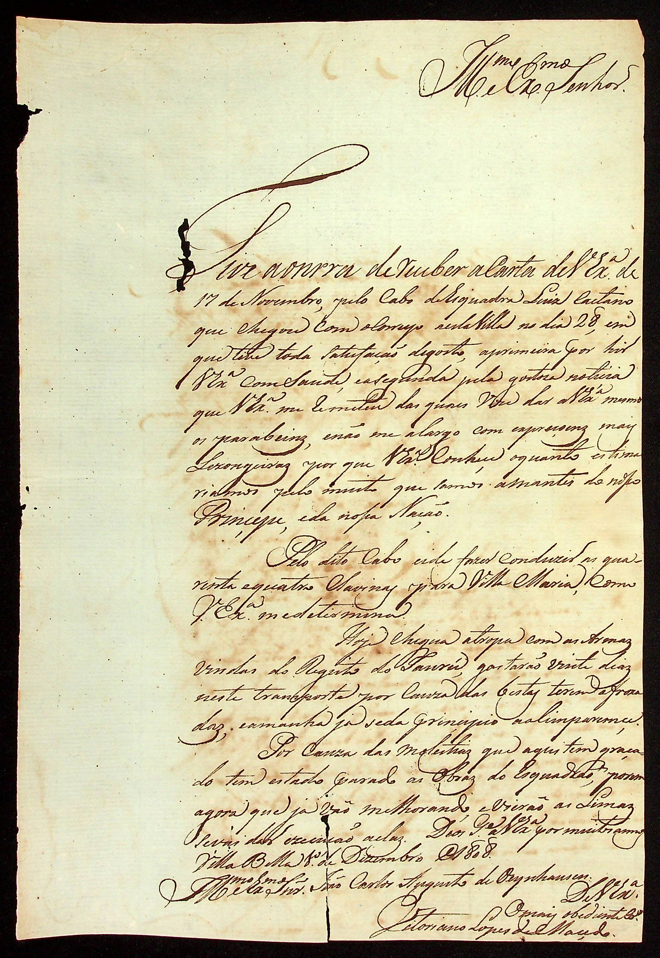 CARTA do [Ajudante de Ordens] Vitoriano Lopes de Macedo ao [Governador e Capitão-General da Capitania de Mato Grosso] João Carlos Augusto d’Oeynhausen e Gravenberg.