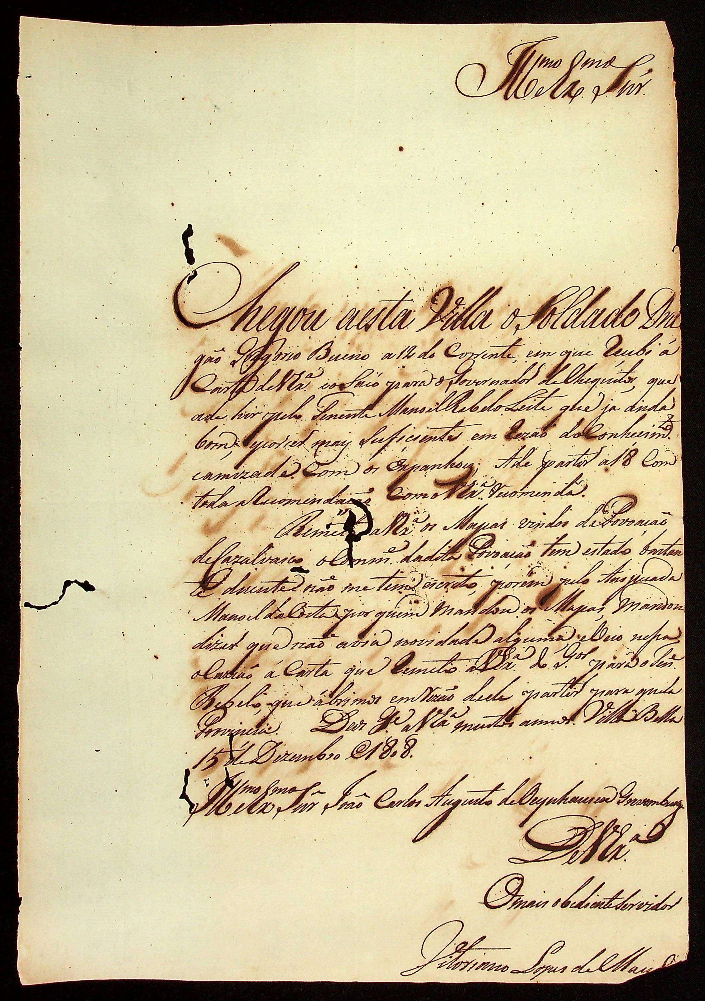 CARTA do [Ajudante de Ordens] Vitoriano Lopes de Macedo ao [Governador e Capitão-General da Capitania de Mato Grosso] João Carlos Augusto d’Oeynhausen e Gravenberg.