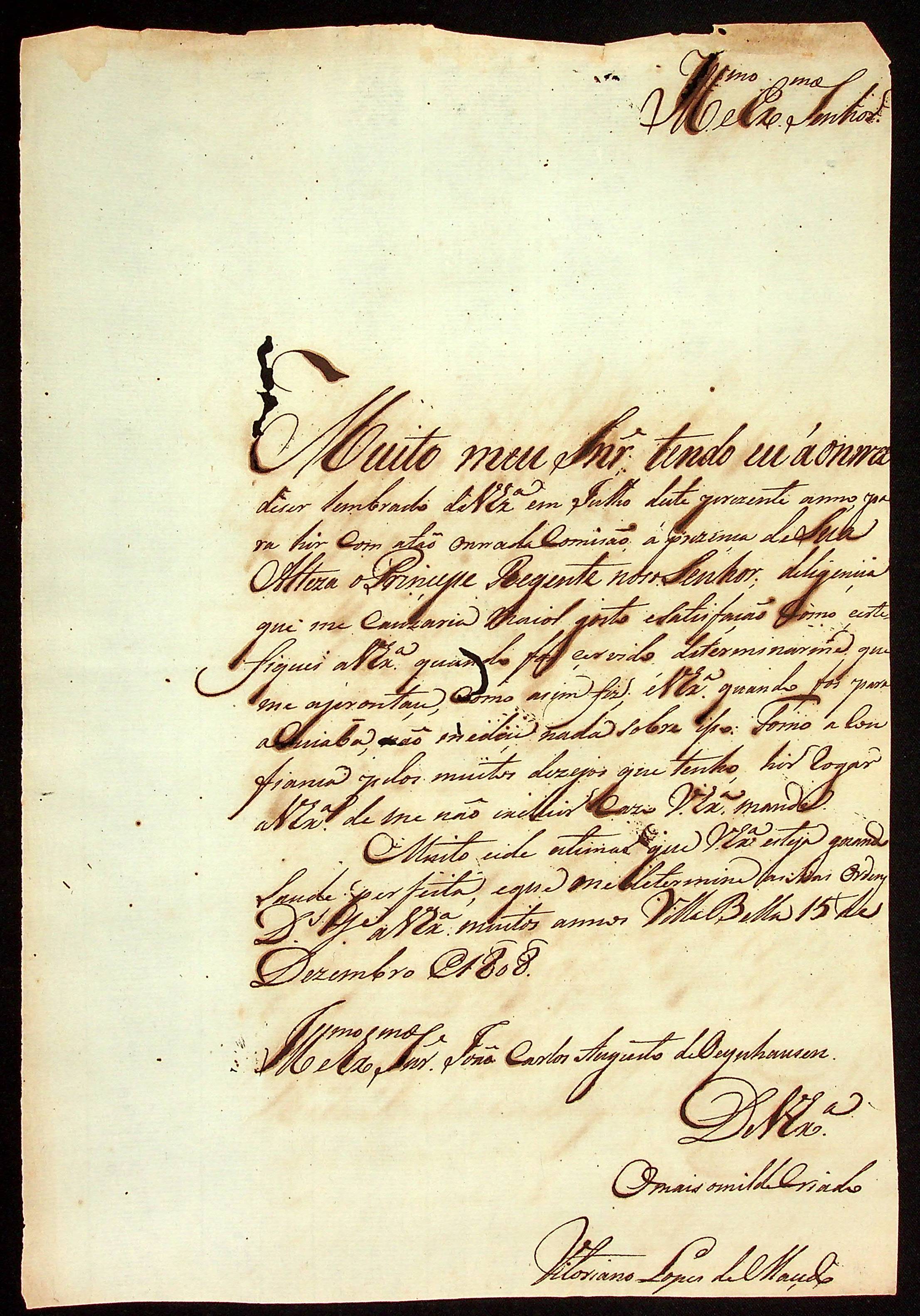 CARTA do [Ajudante de Ordens] Vitoriano Lopes de Macedo ao Governador e Capitão-General da Capitania de Mato Grosso João Carlos Augusto d’Oeynhausen e Gravenberg.