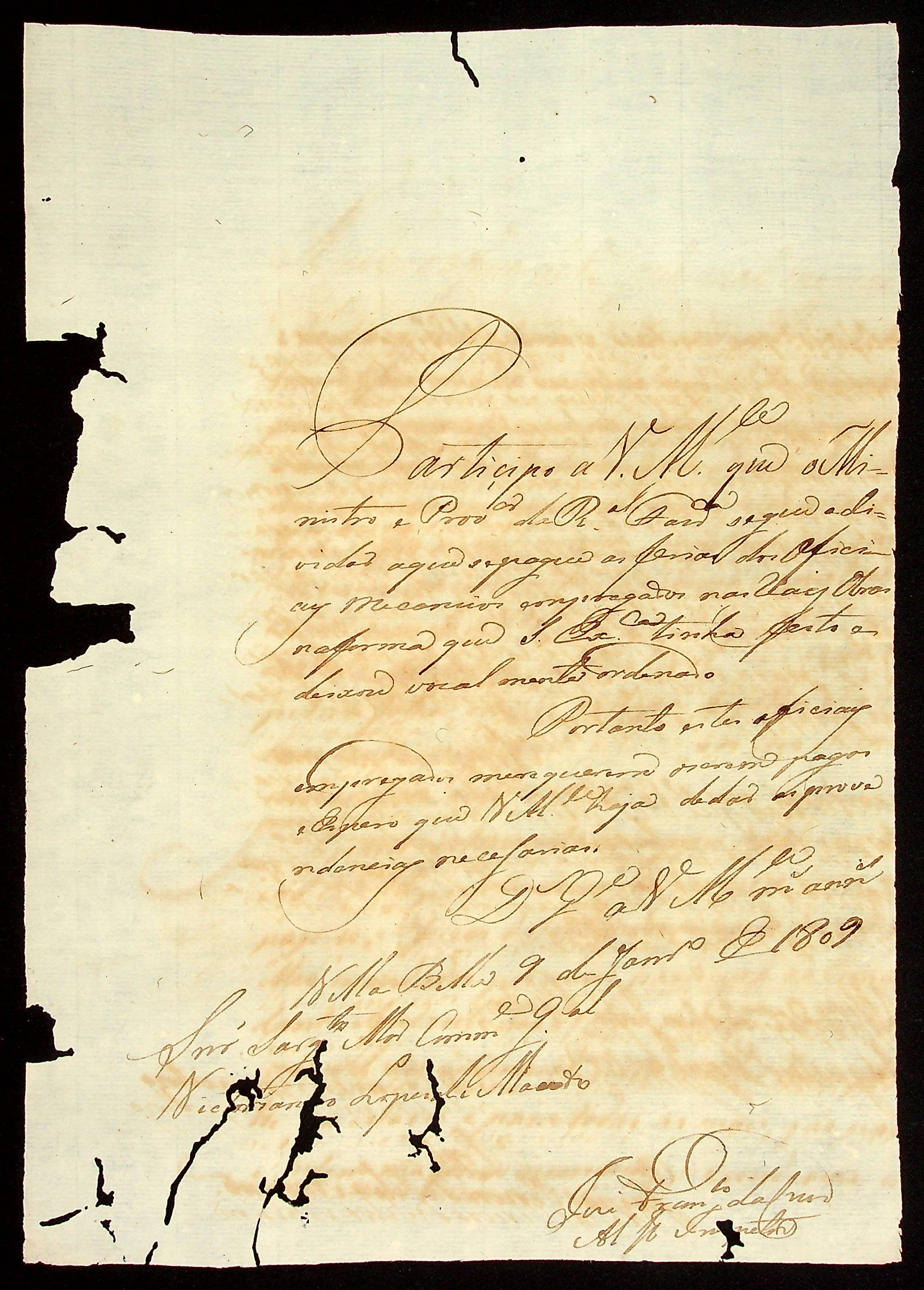 CARTA do Alferes Inspetor José Francisco da [Cruz] ao Sargento-mor e Comandante Geral Vitoriano Lopes de Macedo.