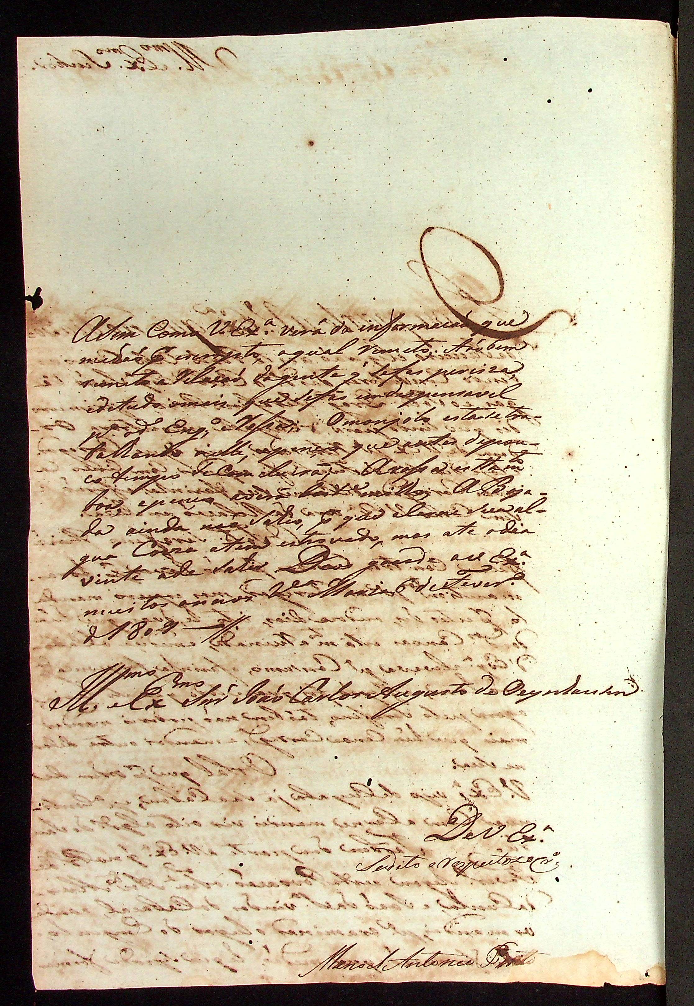 CARTA do [Capitão Comandante] Manoel Antônio Pinto ao [Governador e Capitão-General da Capitania de Mato Grosso] João Carlos Augusto d’Oeynhausen e Gravenberg.