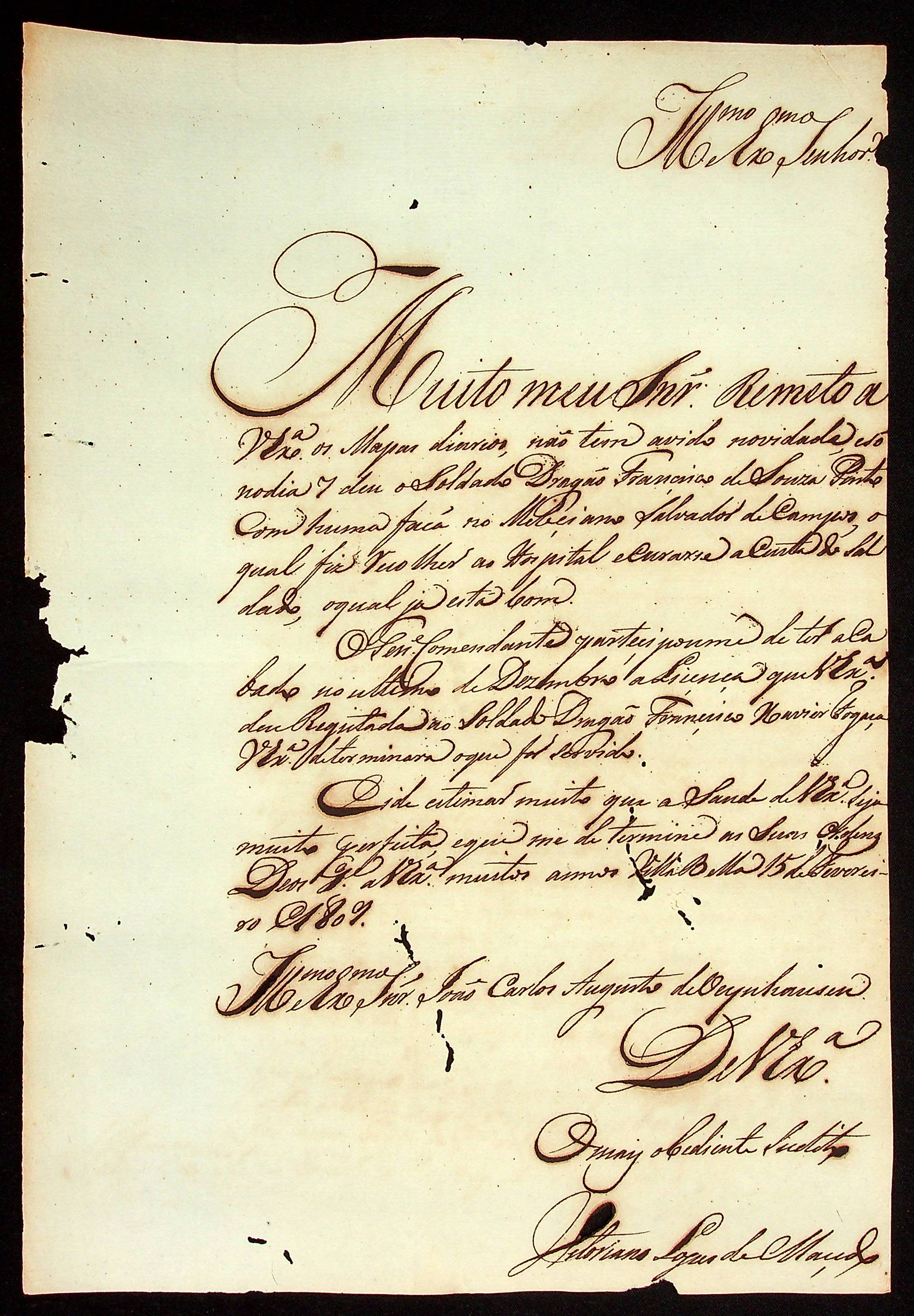 CARTA de Vitoriano Lopes de Macedo ao [Governador e Capitão-General da Capitania de Mato Grosso] João Carlos Augusto d’Oeynhausen e Gravenberg.