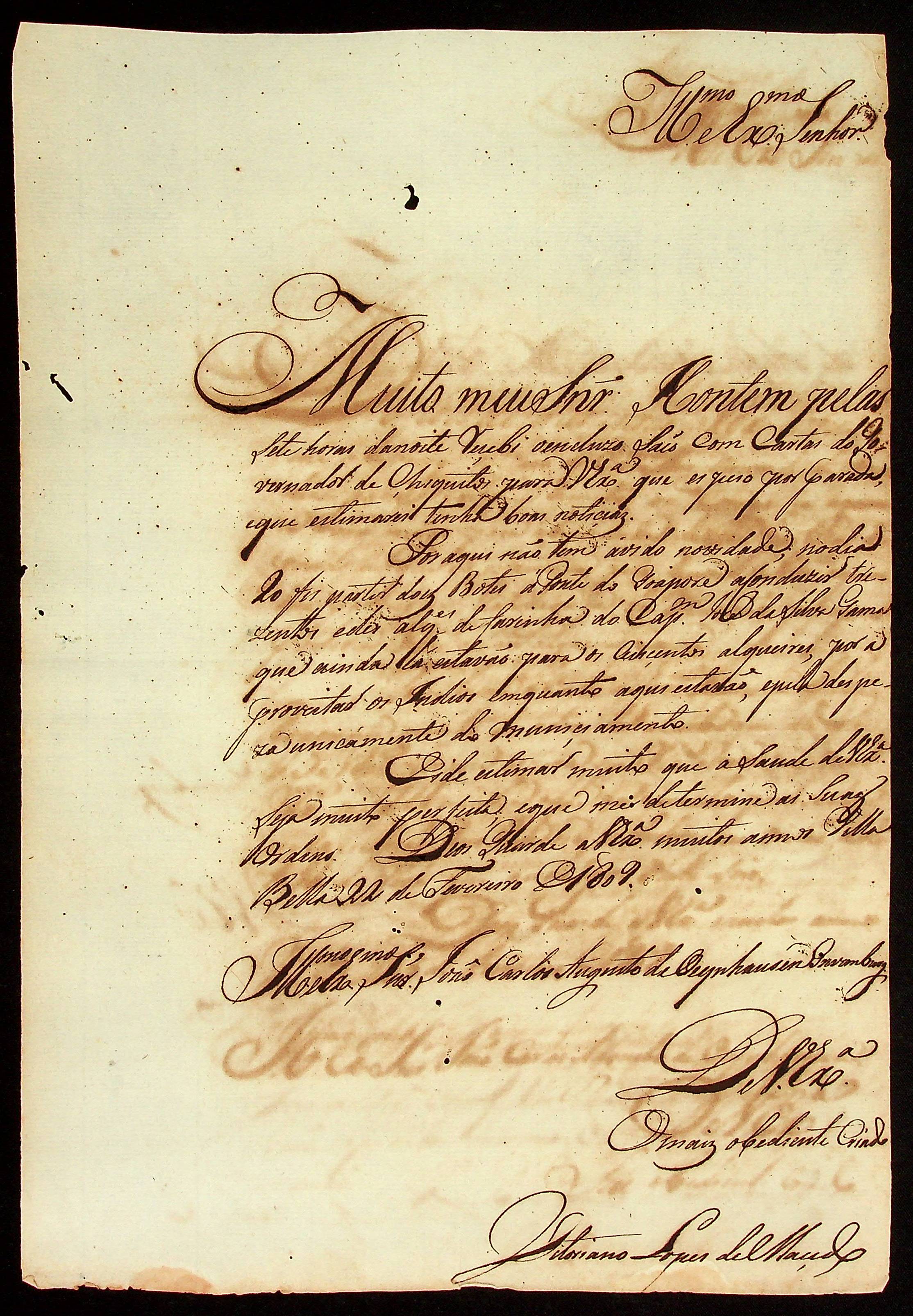CARTA de Vitoriano Lopes de Macedo ao [Governador e Capitão-General da Capitania de Mato Grosso] João Carlos Augusto d’Oeynhausen e Gravenberg.