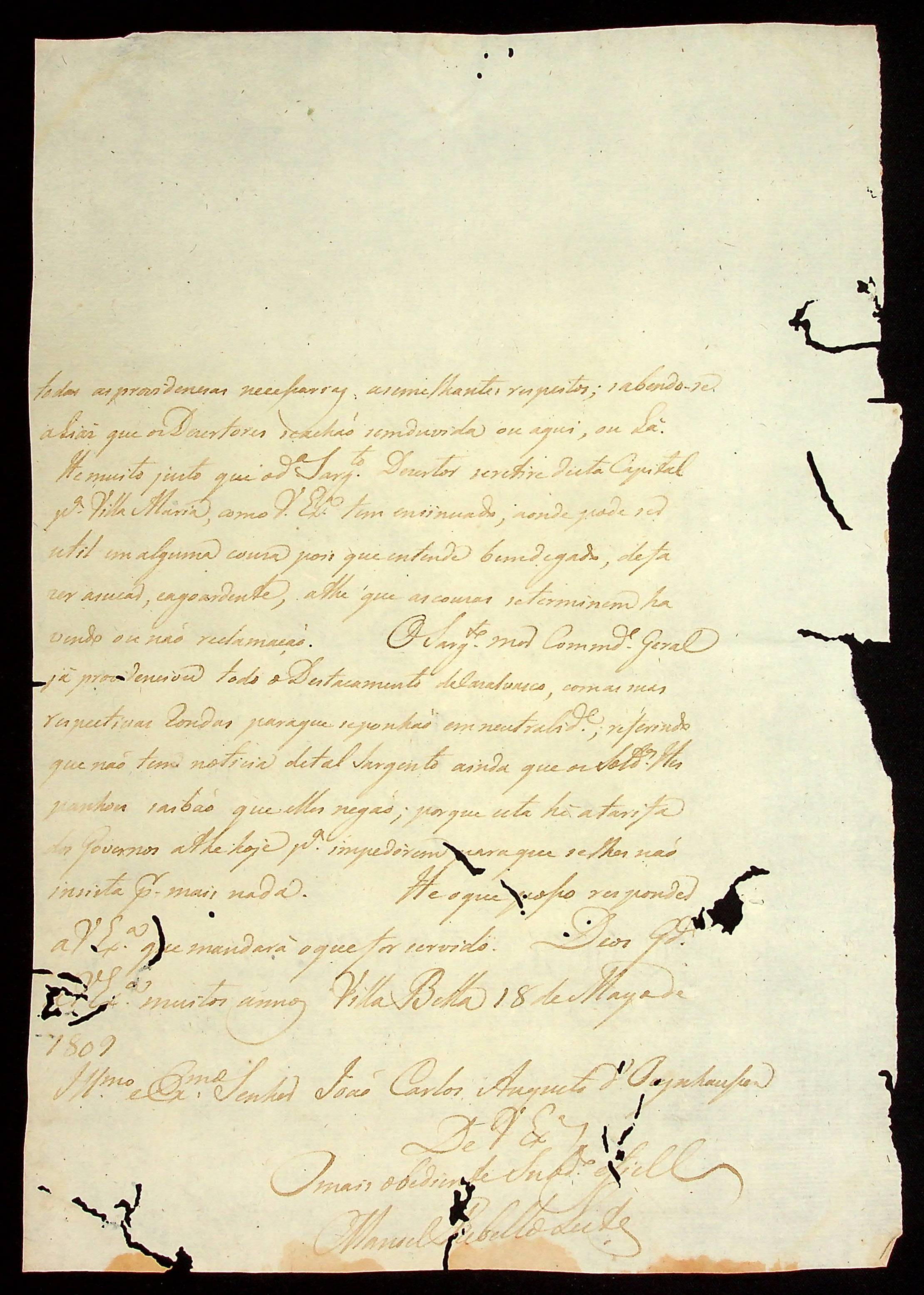 CARTA (incompleta) de Manoel [Rabelo] Leite ao [Governador e Capitão-General da Capitania de Mato Grosso] João Carlos Augusto d’Oeynhausen e Gravenberg.