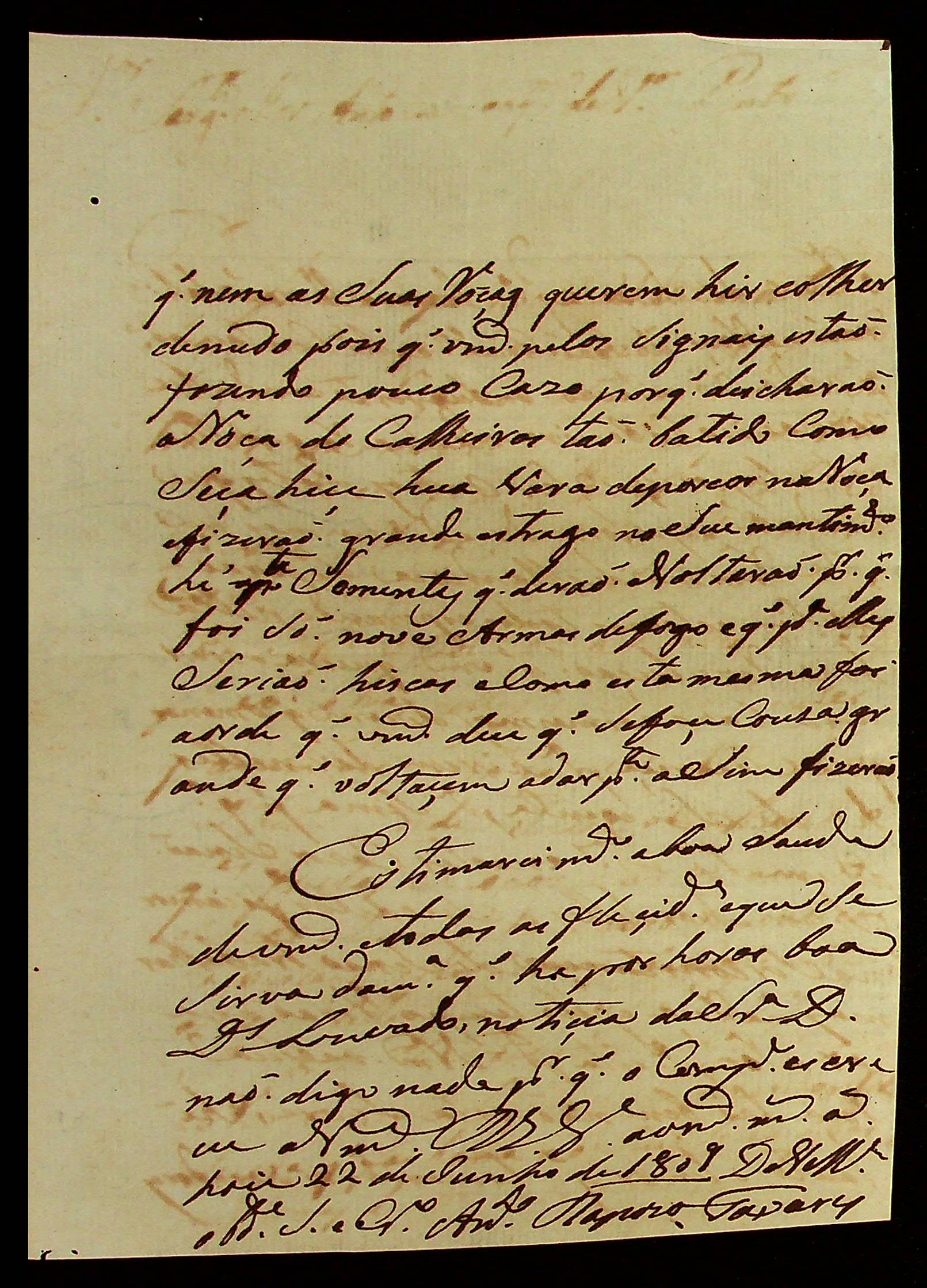 CARTA de Antônio Joaquim de Vasconcelos Pinto ao Sargento-mor Comandante Geral e Ajudante de Ordens Vitoriano Lopes de Macedo.