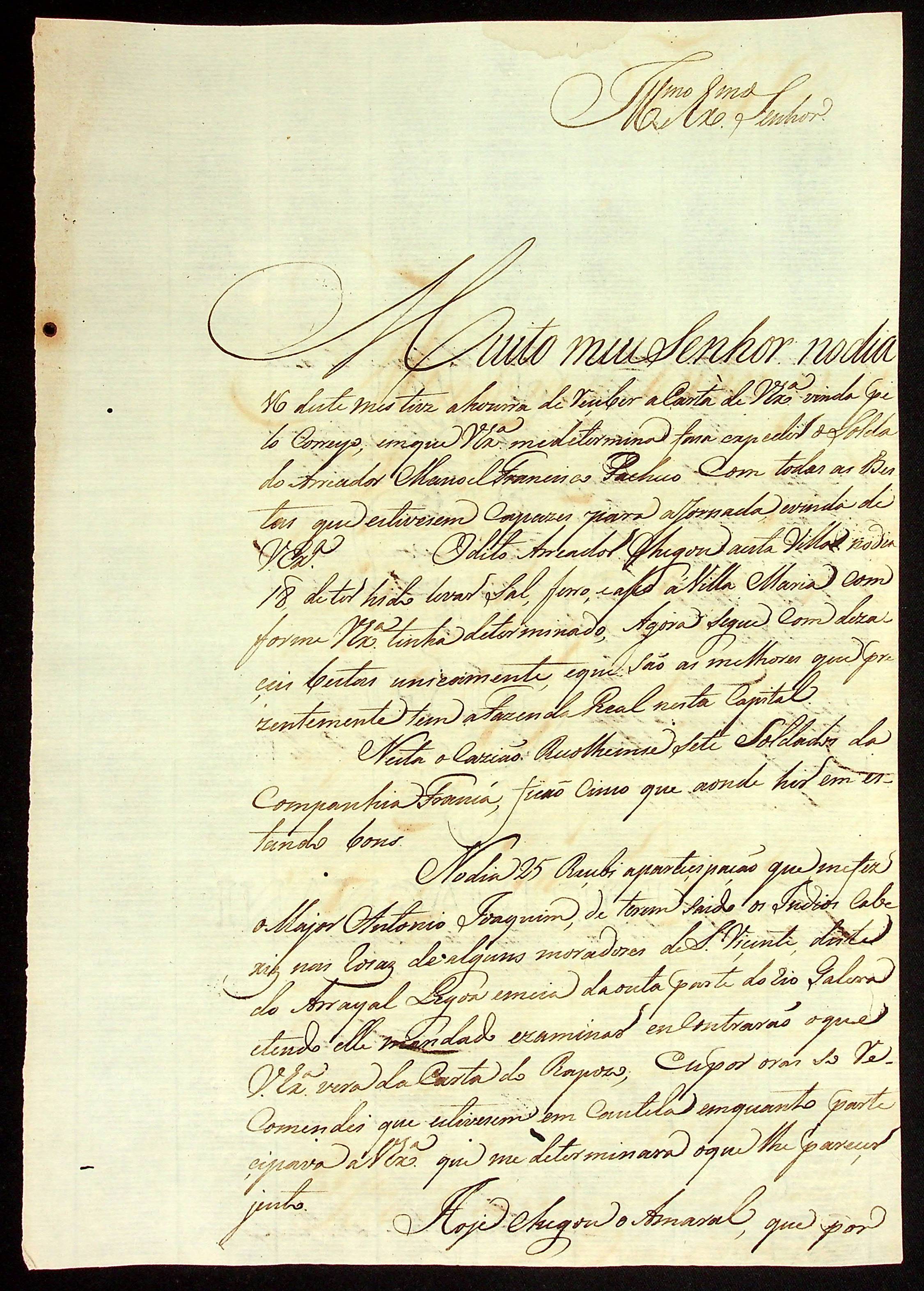 CARTA do [Sargento-mor Comandante e Ajudante de Ordens] Vitoriano Lopes de Macedo ao [Governador e Capitão-General da Capitania de Mato Grosso] João Carlos Augusto d’Oeynhausen e Gravenberg.