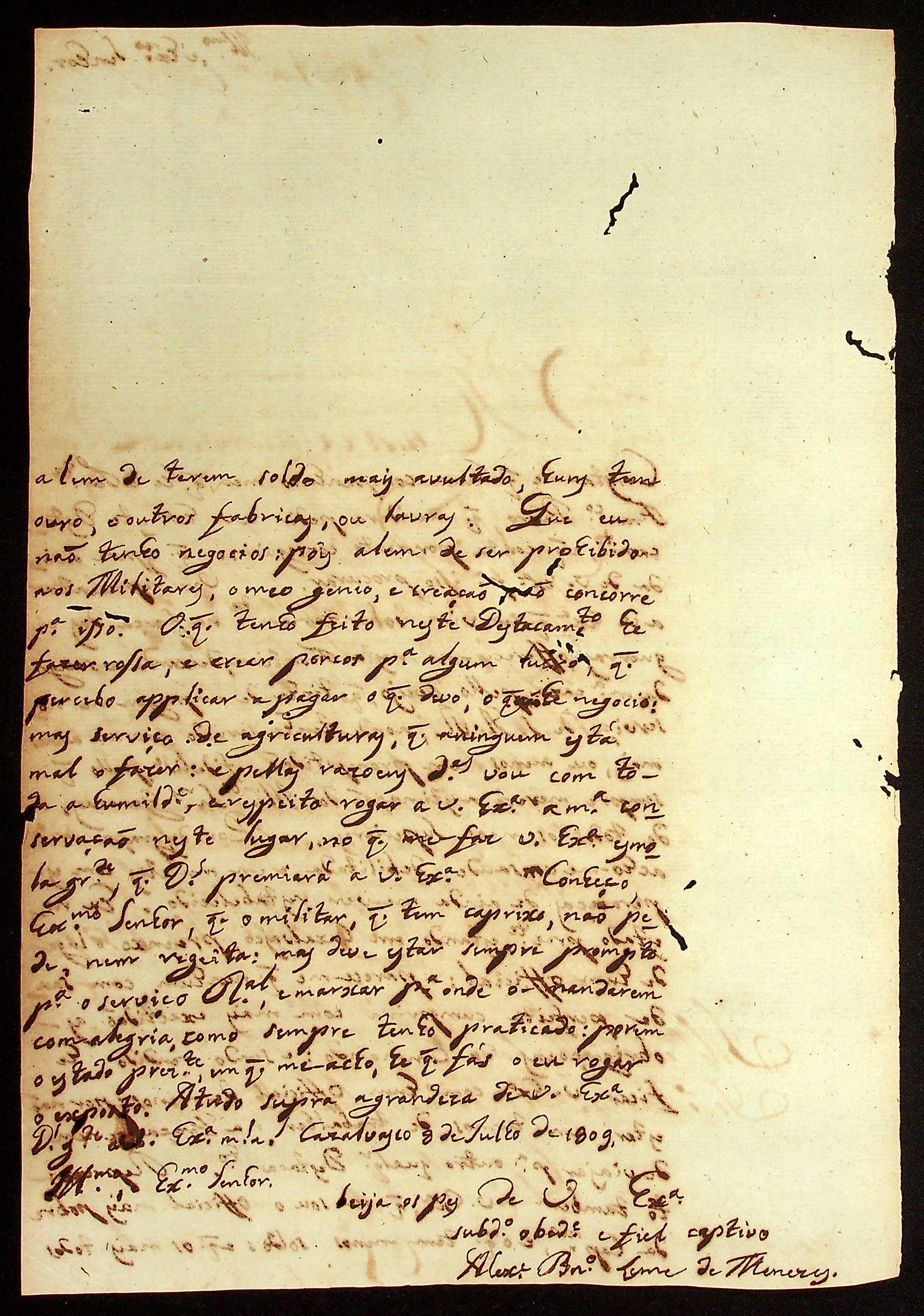 CARTA de Alexandre Brito Leme de Meneses, ao [Governador e Capitão-General da Capitania de Mato Grosso] João Carlos Augusto d’Oeynhausen e Gravenberg.
