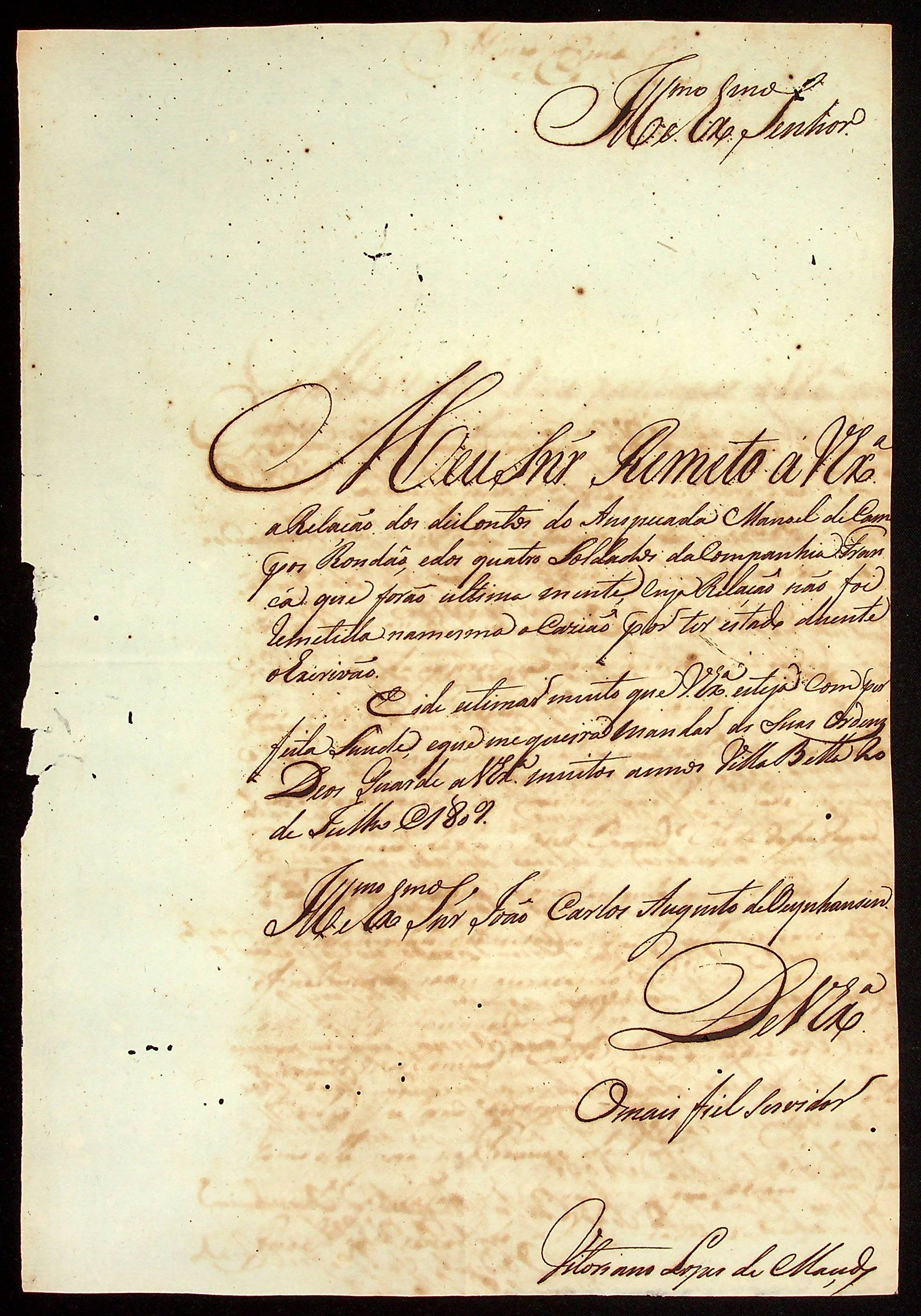 CARTA do [Sargento-mor Comandante Geral e Ajudante de ORDENS] Vitoriano Lopes de Macedo ao [Governador e Capitão-General da Capitania de Mato Grosso] João Carlos Augusto d’Oeynhausen e Gravenberg.