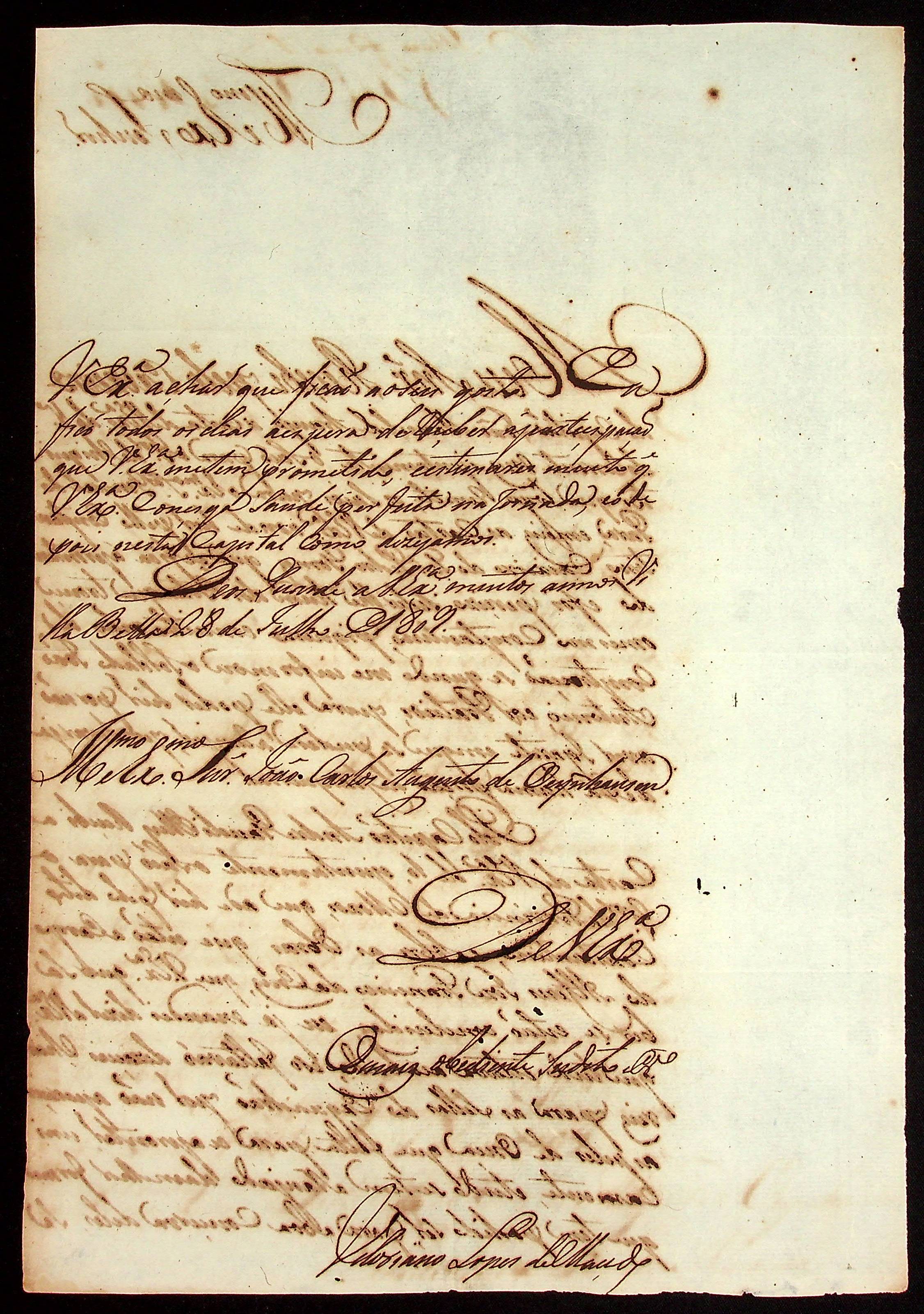 CARTA do [Sargento-mor Comandante e Ajudante de ordens] Vitoriano Lopes de Macedo ao [Governador e Capitão-General da Capitania de Mato Grosso] João Carlos Augusto d’Oeynhausen e Gravenberg.
