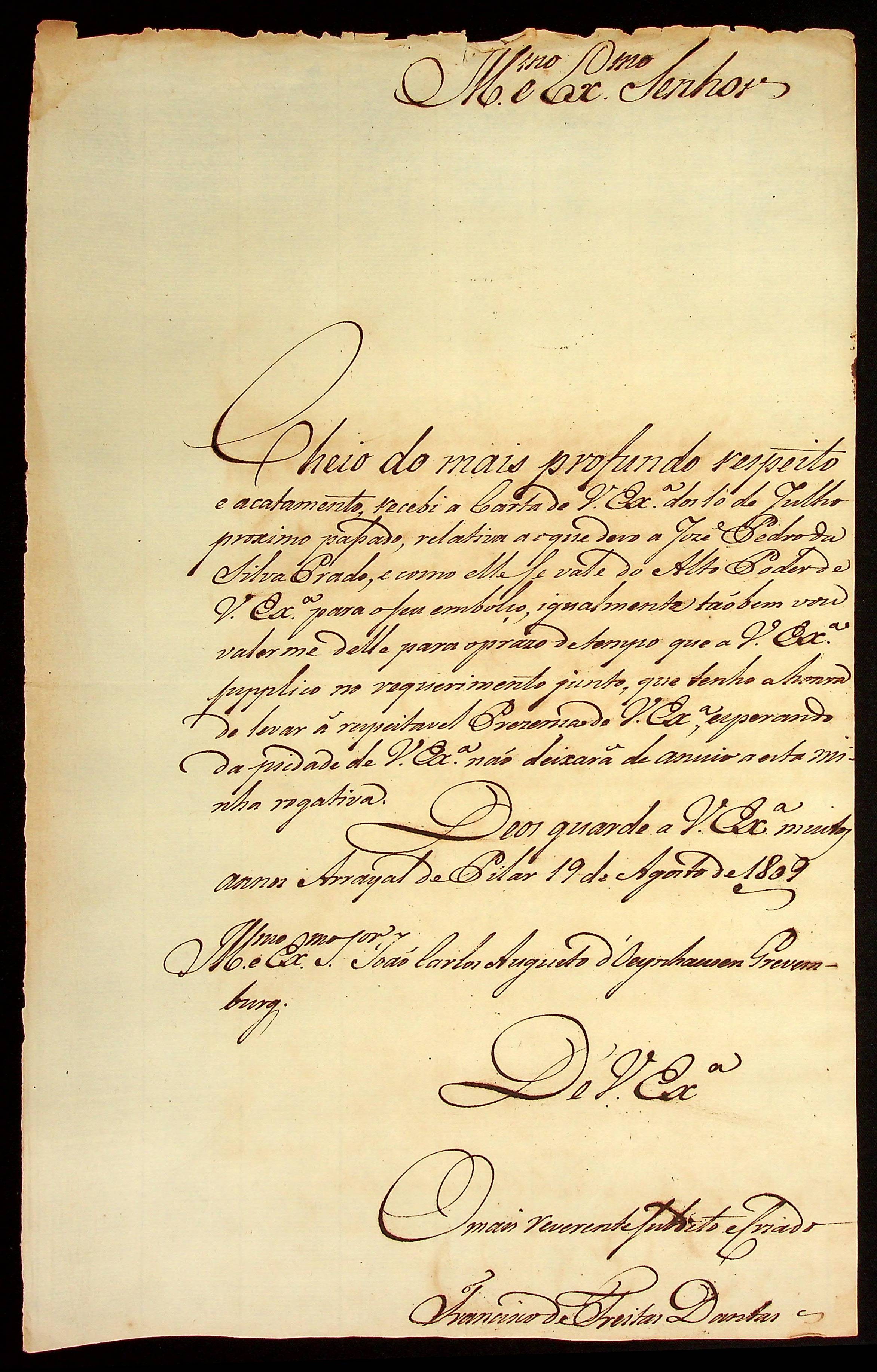 CARTA do] Comandante] Francisco de Freitas Dantas ao [Governador e Capitão-General da Capitania de Mato Grosso] João Carlos Augusto d’Oeynhausen e Gravenberg.