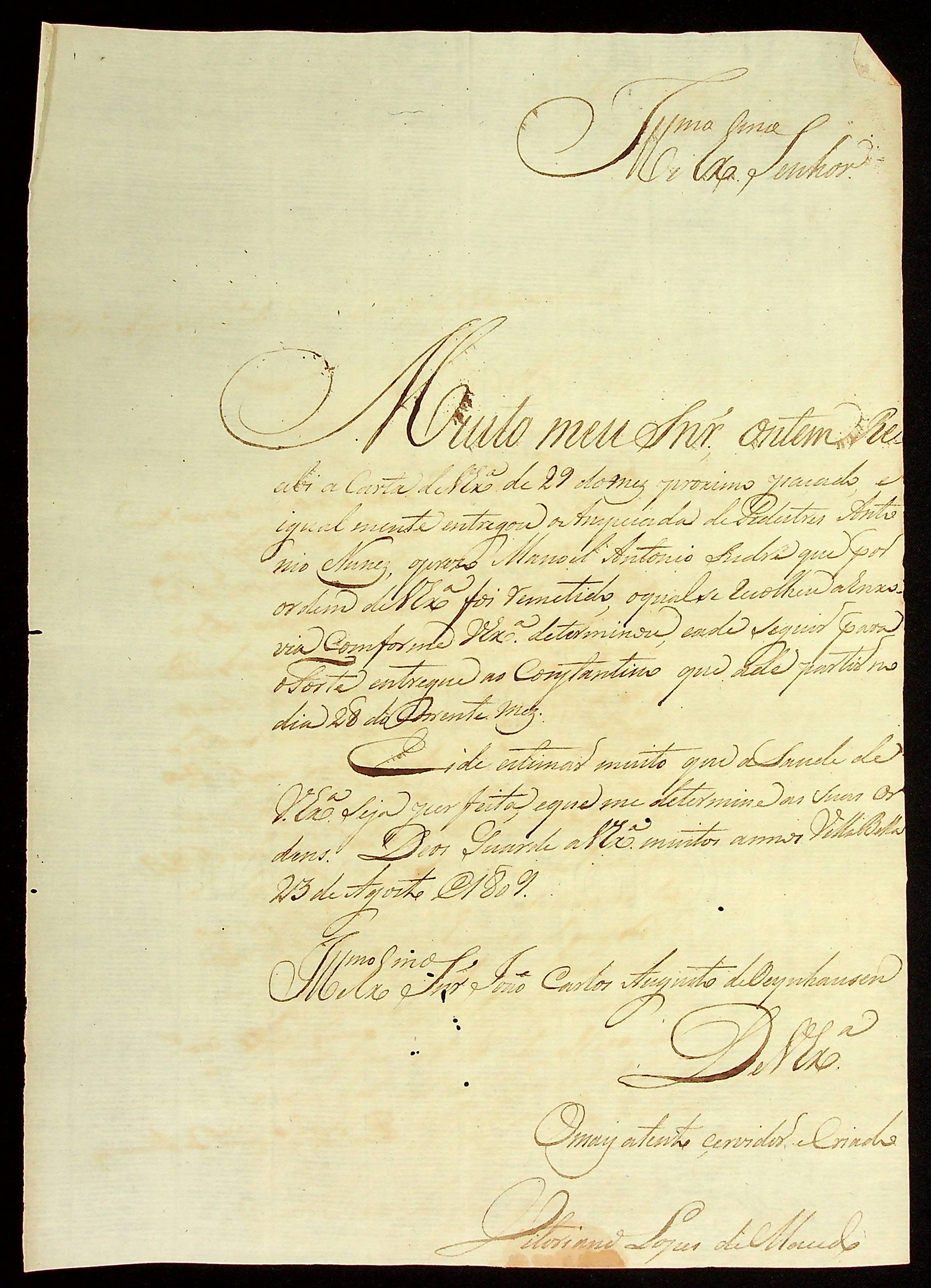 CARTA do [Sargento-mor Comandante e Ajudante de Ordens] Vitoriano Lopes de Macedo ao [Governador e Capitão-General da Capitania de Mato Grosso] João Carlos Augusto d’Oeynhausen e Gravenberg.