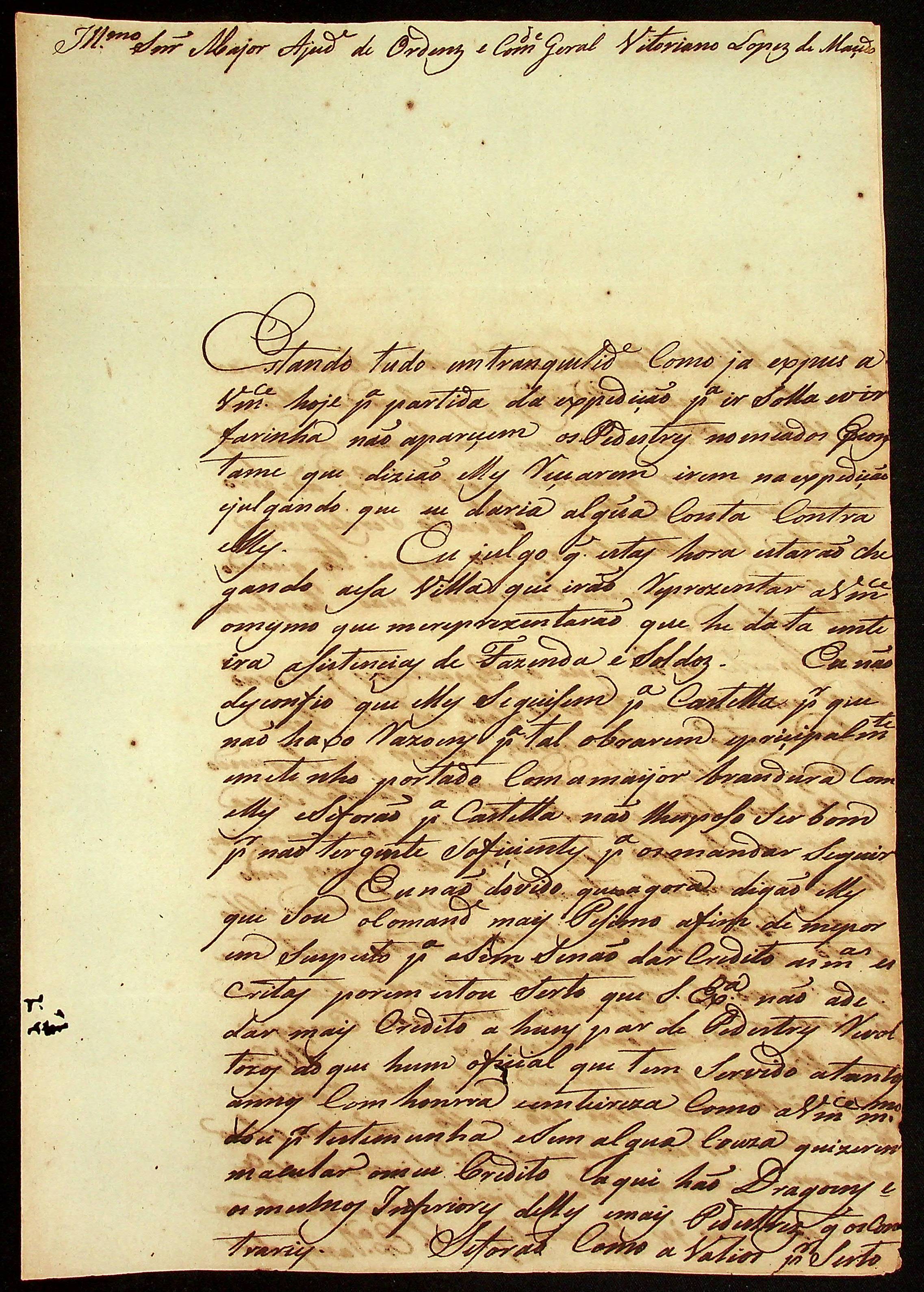 CARTA de Alexandre Brito Leme de Meneses ao [Governador e Capitão-General da Capitania de Mato Grosso] João Carlos Augusto d’Oeynhausen e Gravenberg.
