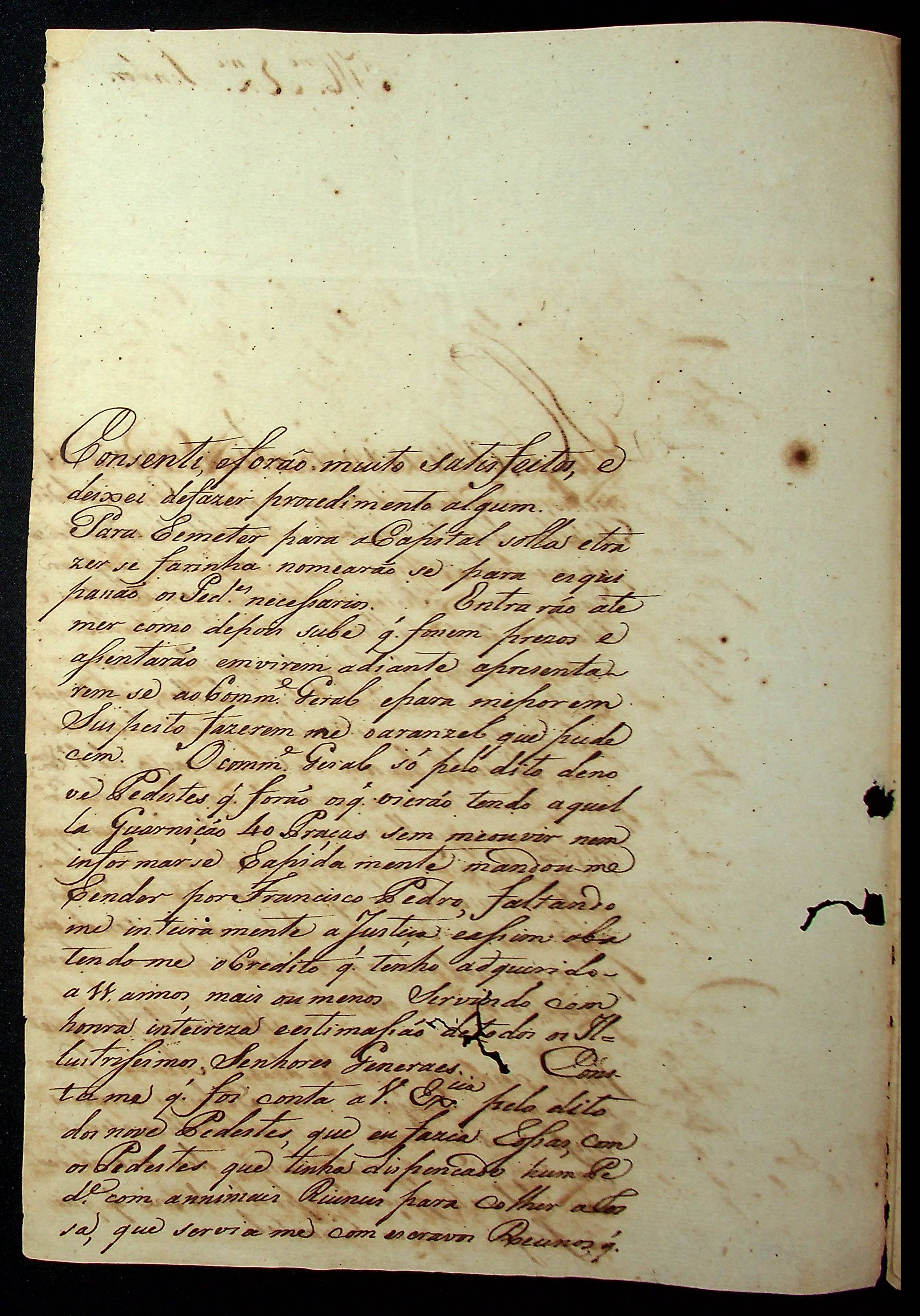 CARTA de Alexandre Brito Leme de Meneses ao [Governador e Capitão-General da Capitania de Mato Grosso João] Carlos Augusto d’Oeynhausen e Gravenberg.