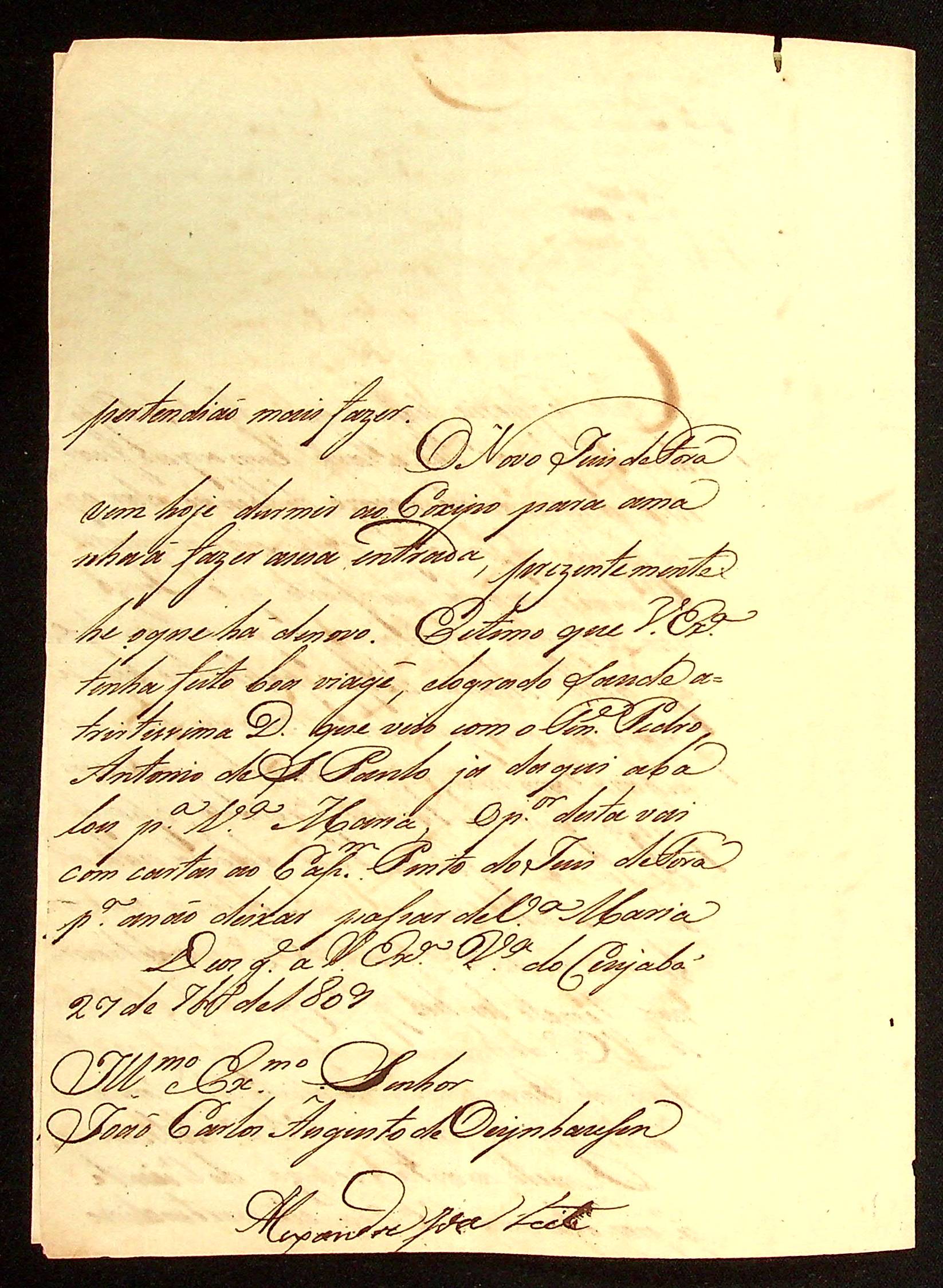 CARTA de Alexandre José Leite de Chaves Melo ao [Governador e Capitão-General da Capitania de Mato Grosso] João Carlos Augusto d’Oeynhausen e Gravenberg.