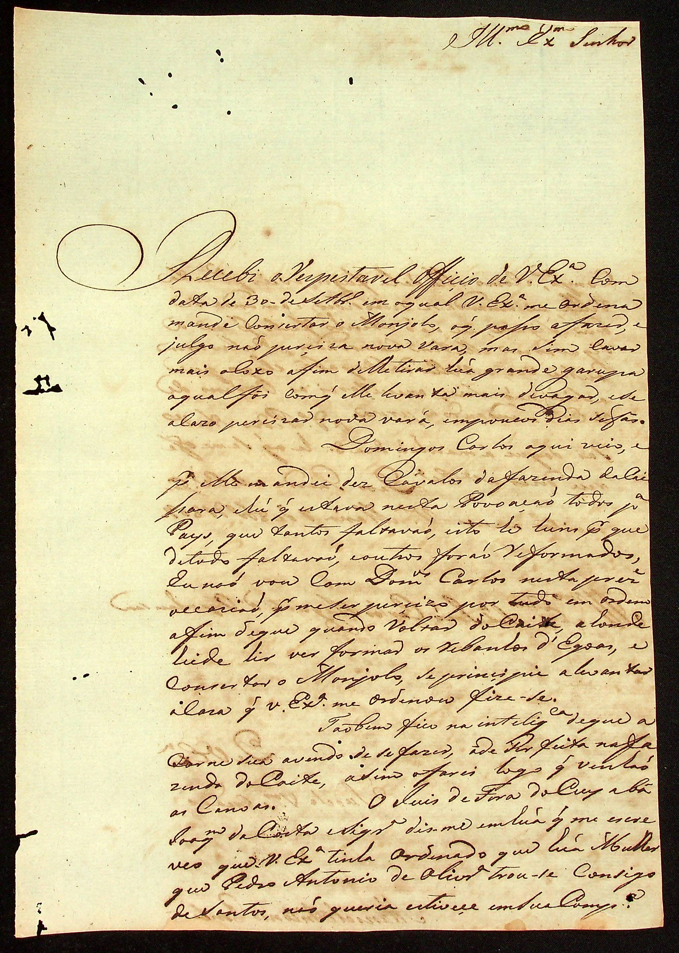 CARTA do [Comandante de Vila Maria] Manoel Antônio Pinto ao [Governador e Capitão-General da Capitania de Mato Grosso] João Carlos Augusto d’Oeynhausen e Gravenberg.