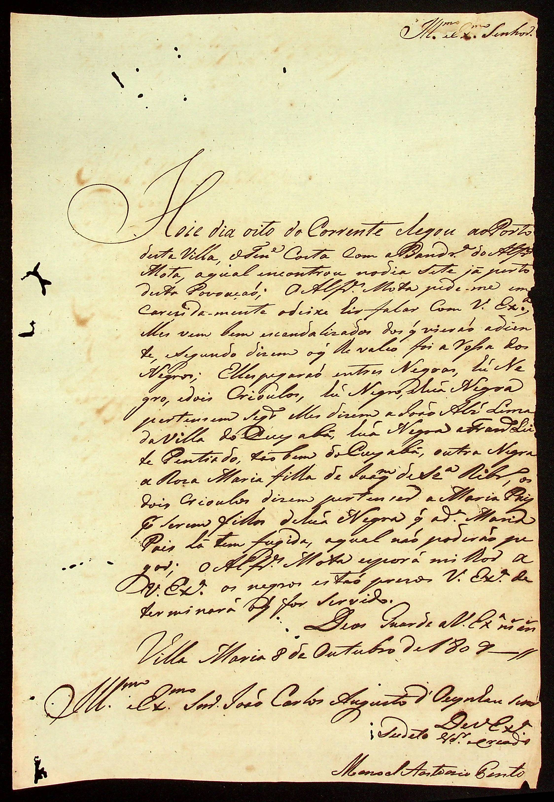 CARTA do [Comandante de Vila Maria] Manoel Antônio Pinto ao [Governador e Capitão-General da Capitania de Mato Grosso] João Carlos Augusto d’Oeynhausen e Gravenberg.