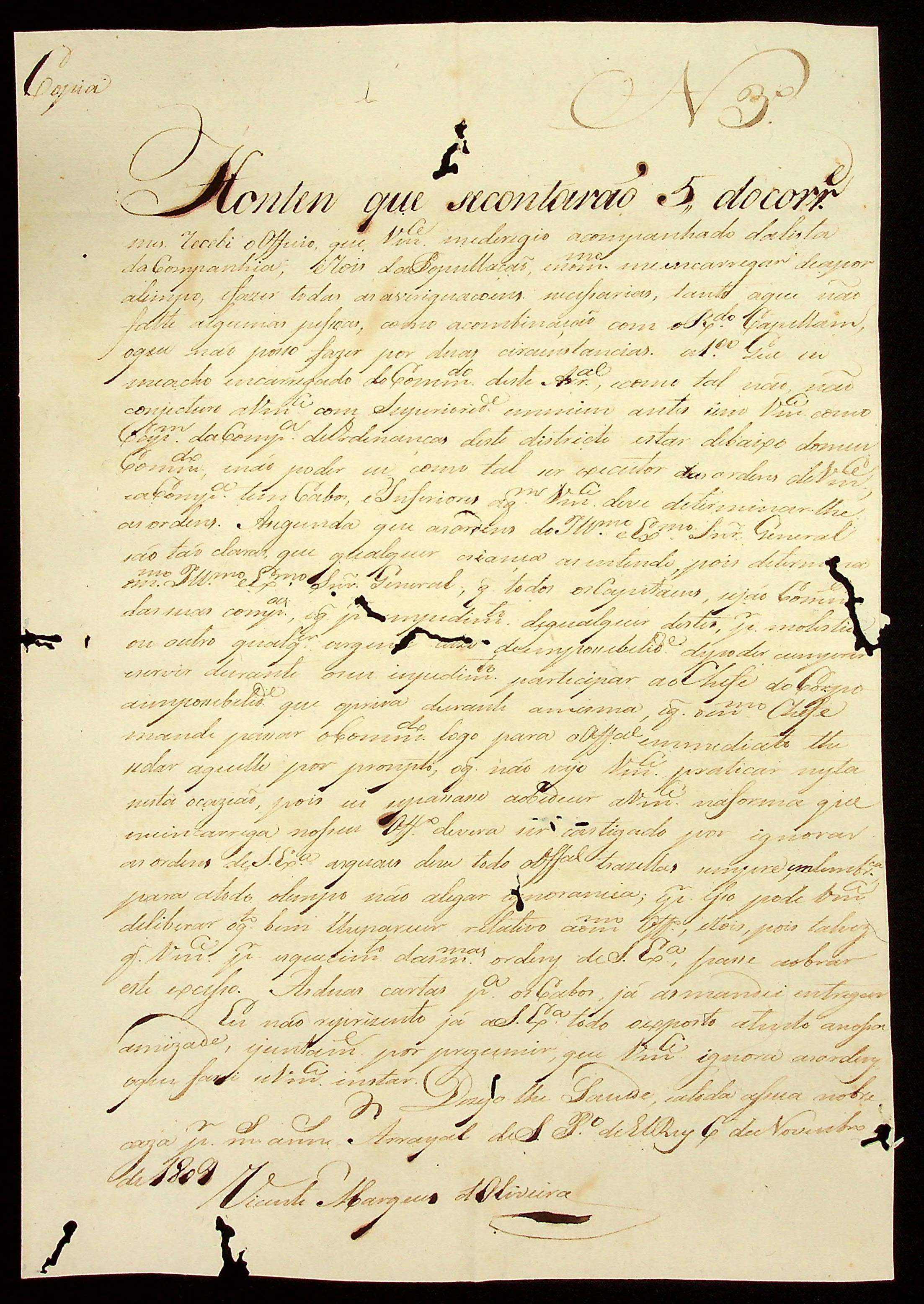 CARTA (cópia) do [Alferes Comandante] Vicente Marques de Oliveira ao [Governador e Capitão-General da Capitania de Mato Grosso João Carlos Augusto d’Oeynhausen e Gravenberg].