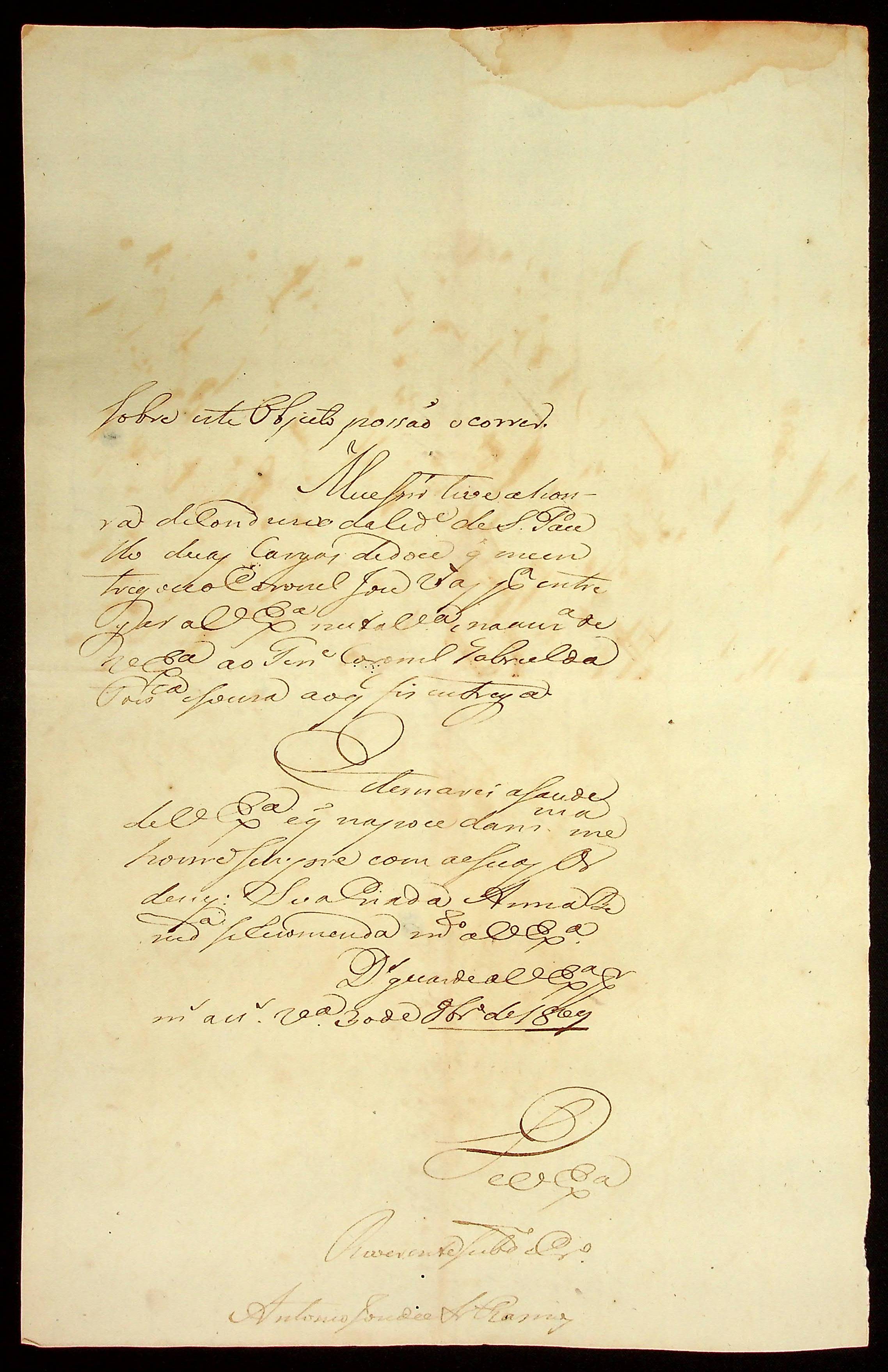 CARTA do [Capitão da Primeira Companhia de Fuzileiros] Antônio José de Ramos ao [Governador e Capitão-General da Capitania de Mato Grosso João Carlos Augusto d’Oeynhausen e Gravenberg].