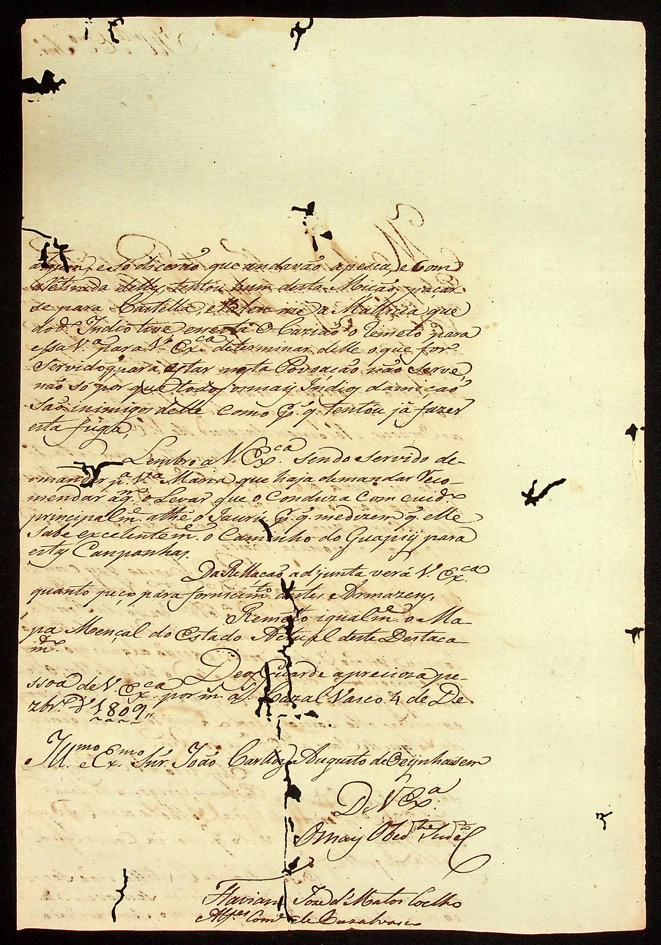 CARTA do [Alferes Comandante] Flaviano José de Matos Coelho ao [Governador e Capitão-General da Capitania de Mato Grosso] João Carlos Augusto d’Oeynhausen e Gravenberg.