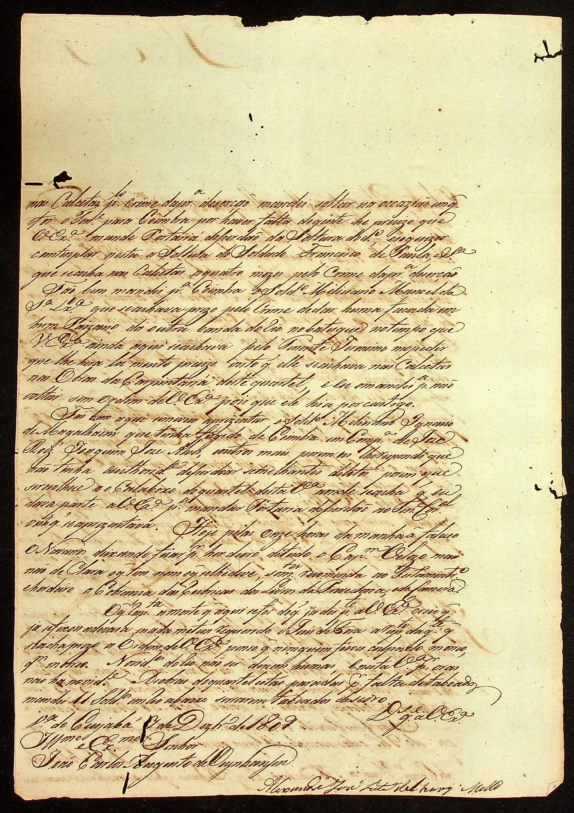 CARTA do [Sargento-mor Comandante e Ajudante de Ordens] Alexandre José Leite de Chaves Melo ao [Governador e Capitão-General da Capitania de Mato Grosso] João Carlos Augusto d’Oeynhausen e Gravenberg.