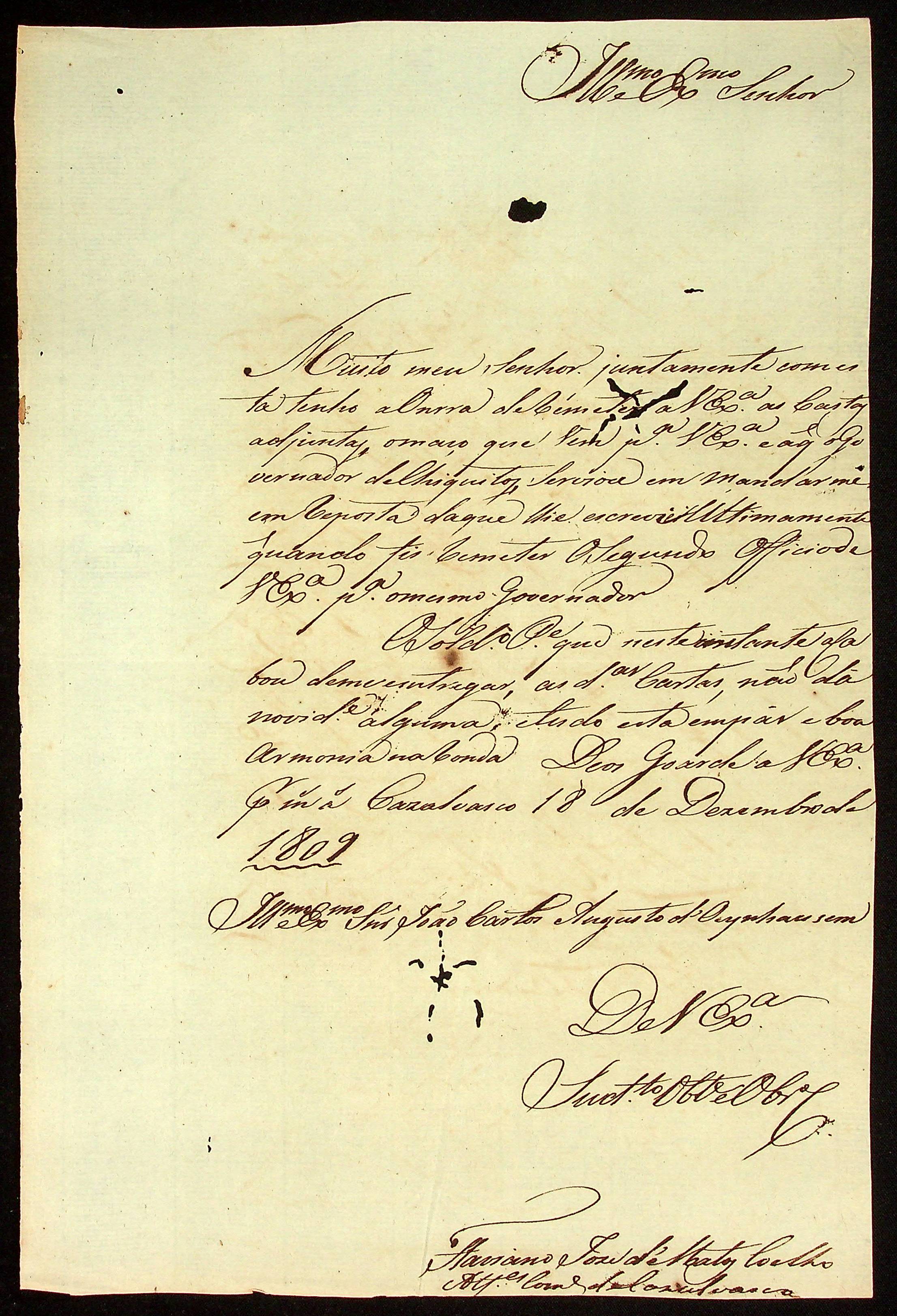 CARTA do [Alferes Comandante] Flaviano José de Matos Coelho ao [Governador e Capitão-General da Capitania de Mato Grosso] João Carlos Augusto d’Oeynhausen e Gravenberg.