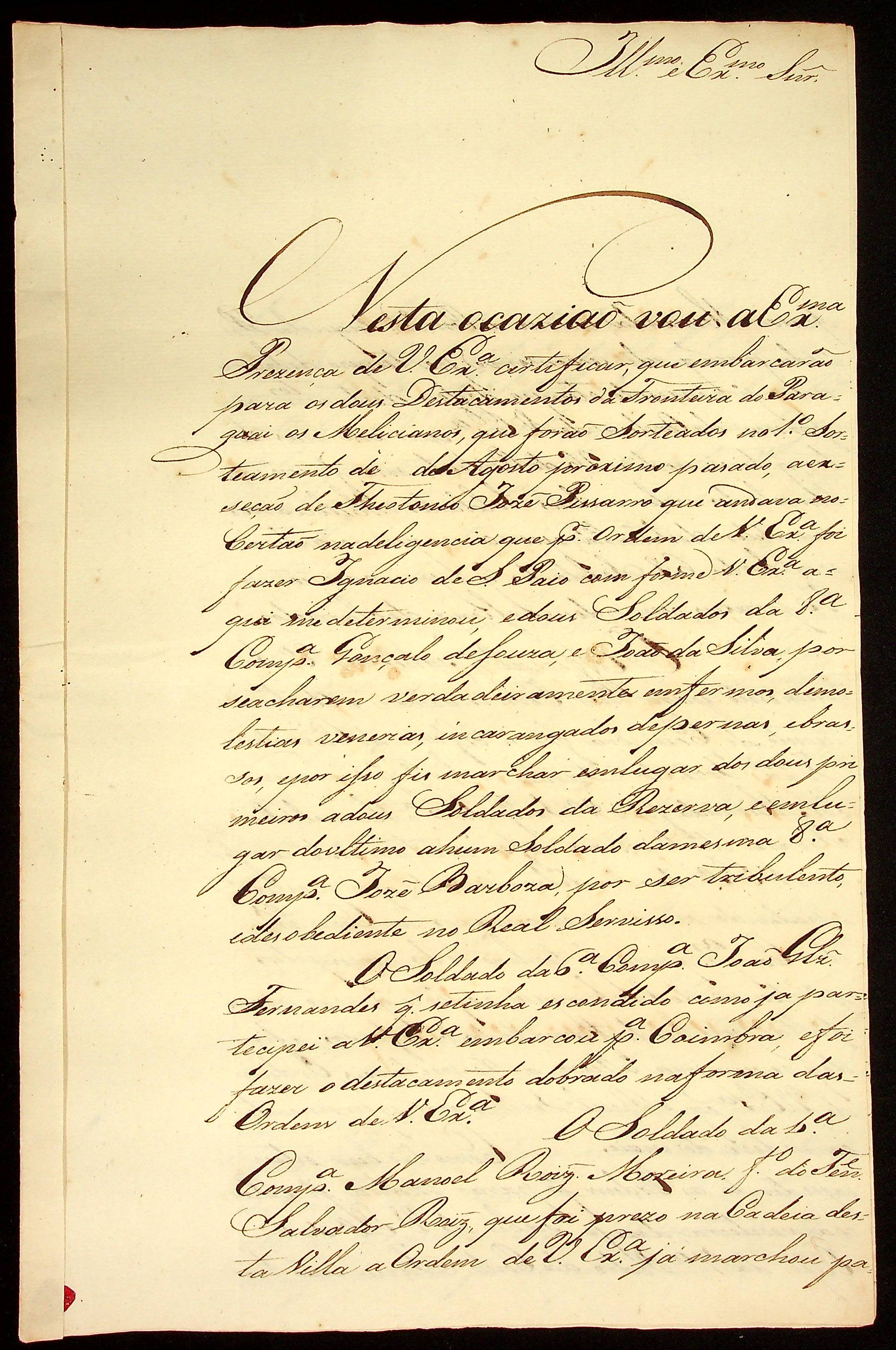 CARTA do [Tenente-Coronel] Gabriel de Fonseca Souza ao [Governador e Capitão-General da Capitania de Mato Grosso] João Carlos Augusto d’Oeynhausen e Gravenberg.