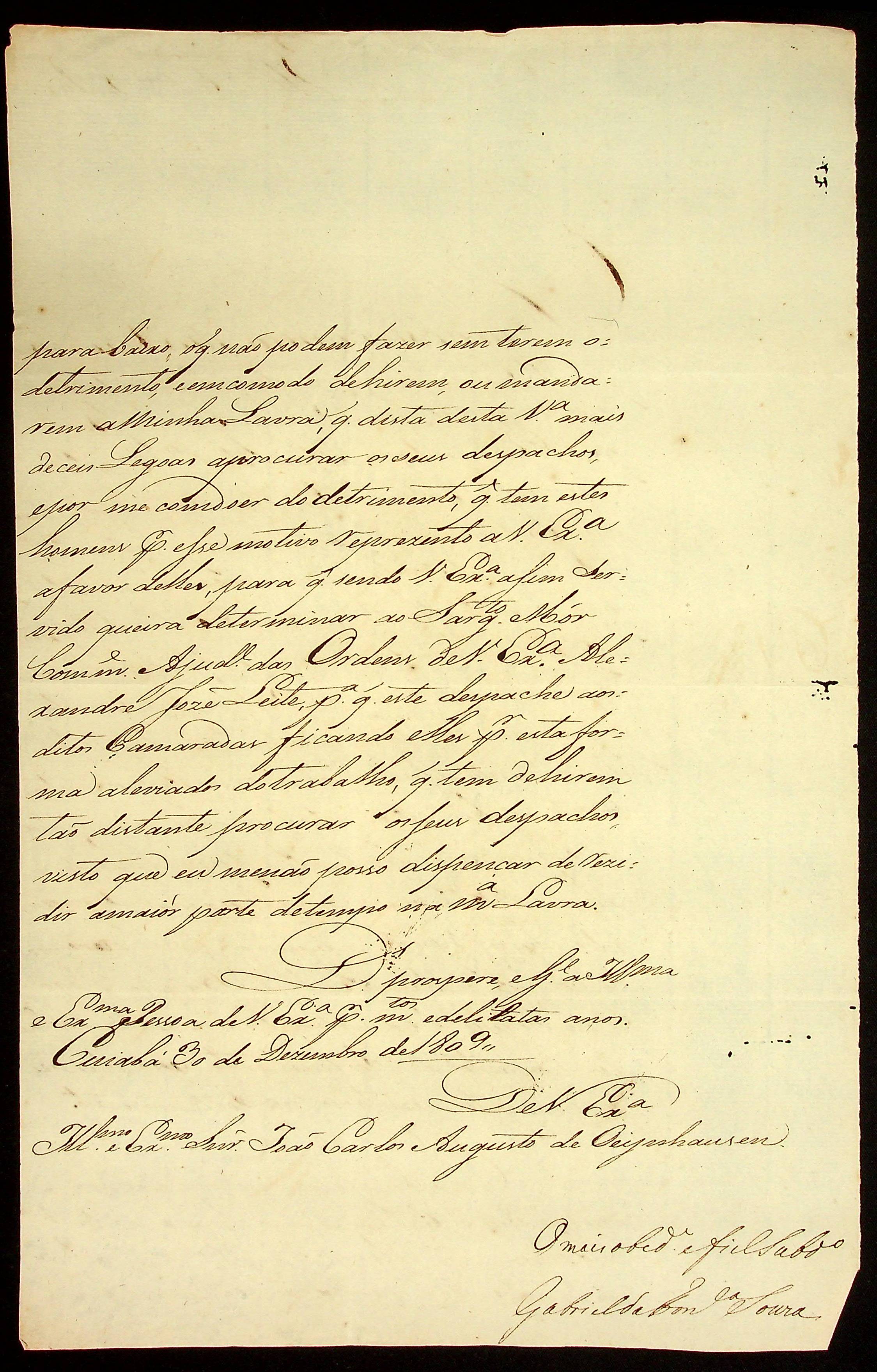 CARTA do [Tenente-Coronel] Gabriel de Fonseca Souza ao [Governador e Capitão-General da Capitania de Mato Grosso] João Carlos Augusto d’Oeynhausen e Gravenberg.