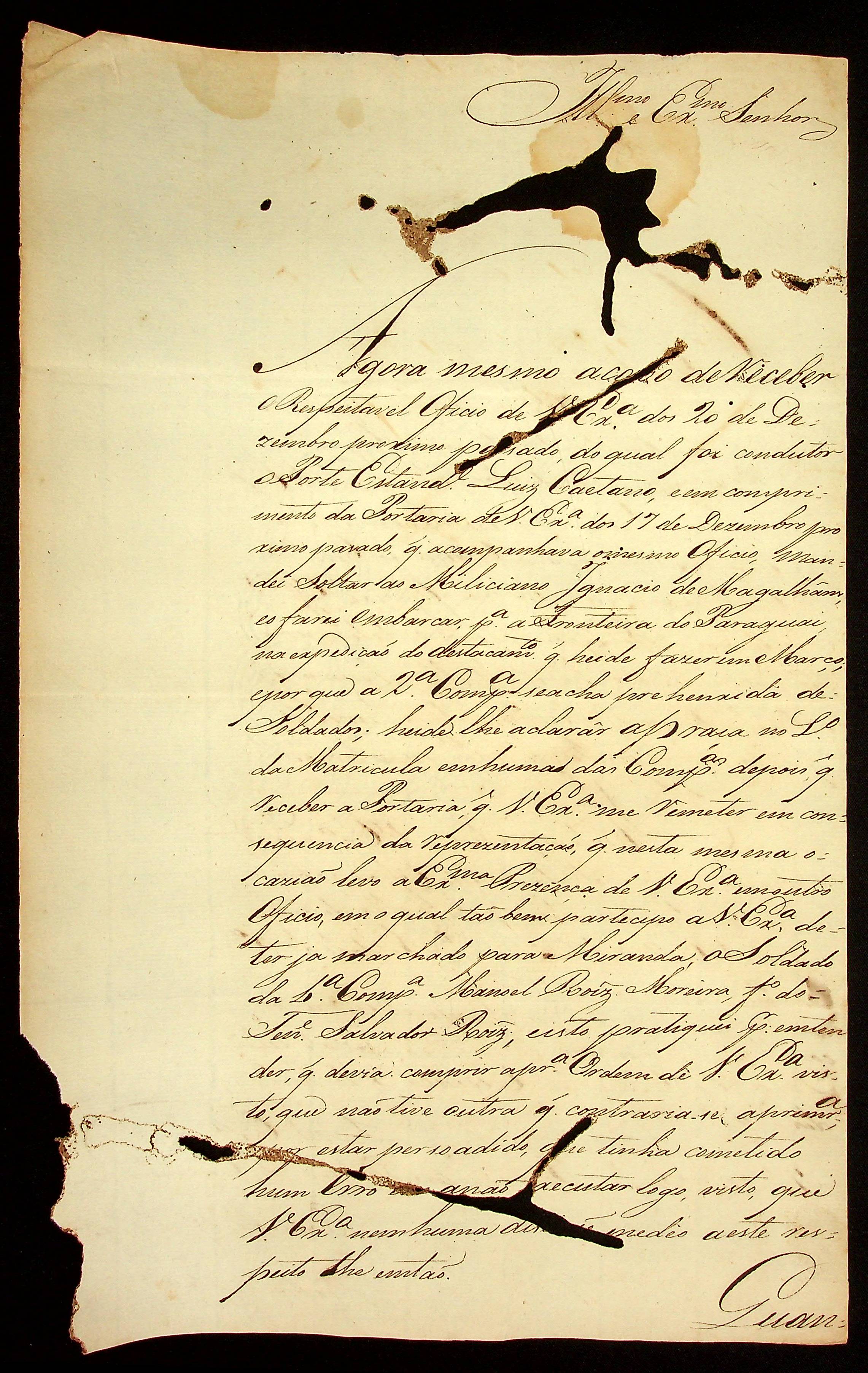 CARTA do [Tenente-Coronel da Legião de Milícias] Gabriel de Fonseca Souza ao [Governador e Capitão-General da Capitania de Mato Grosso] João Carlos Augusto d’Oeynhausen e Gravenberg.