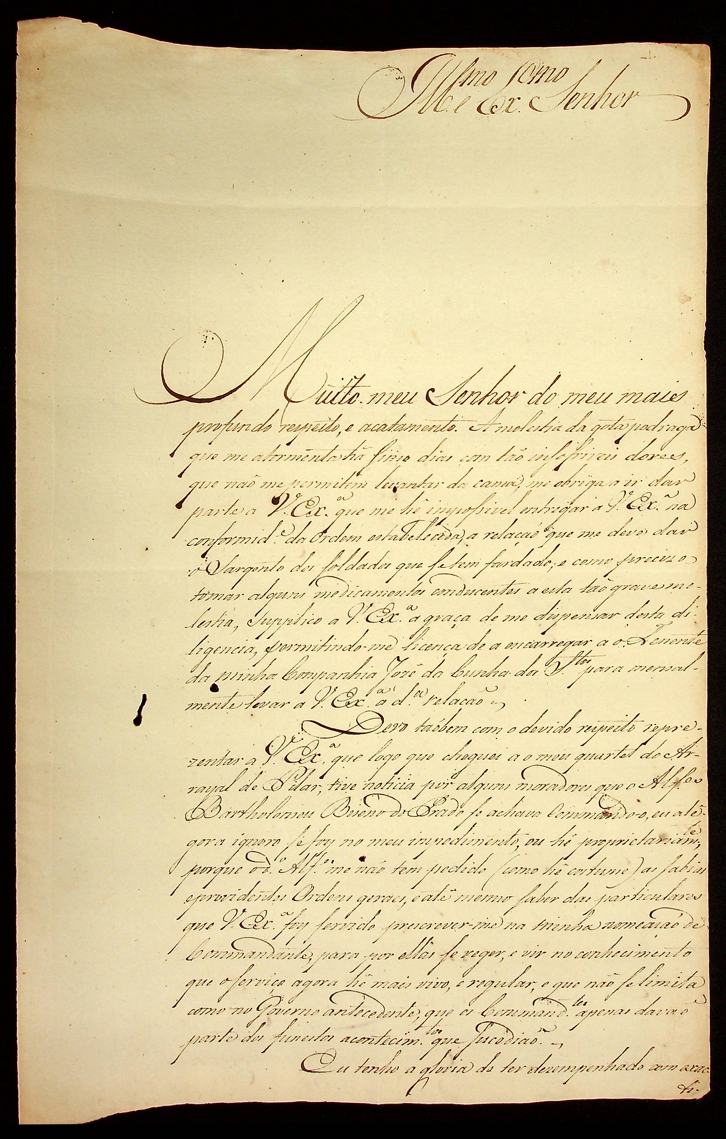 CARTA do [Comandante de Pilar] Francisco de Freitas Dantas ao [Governador e Capitão-General da Capitania de Mato Grosso] João Carlos Augusto d’Oeynhausen e Gravenberg.