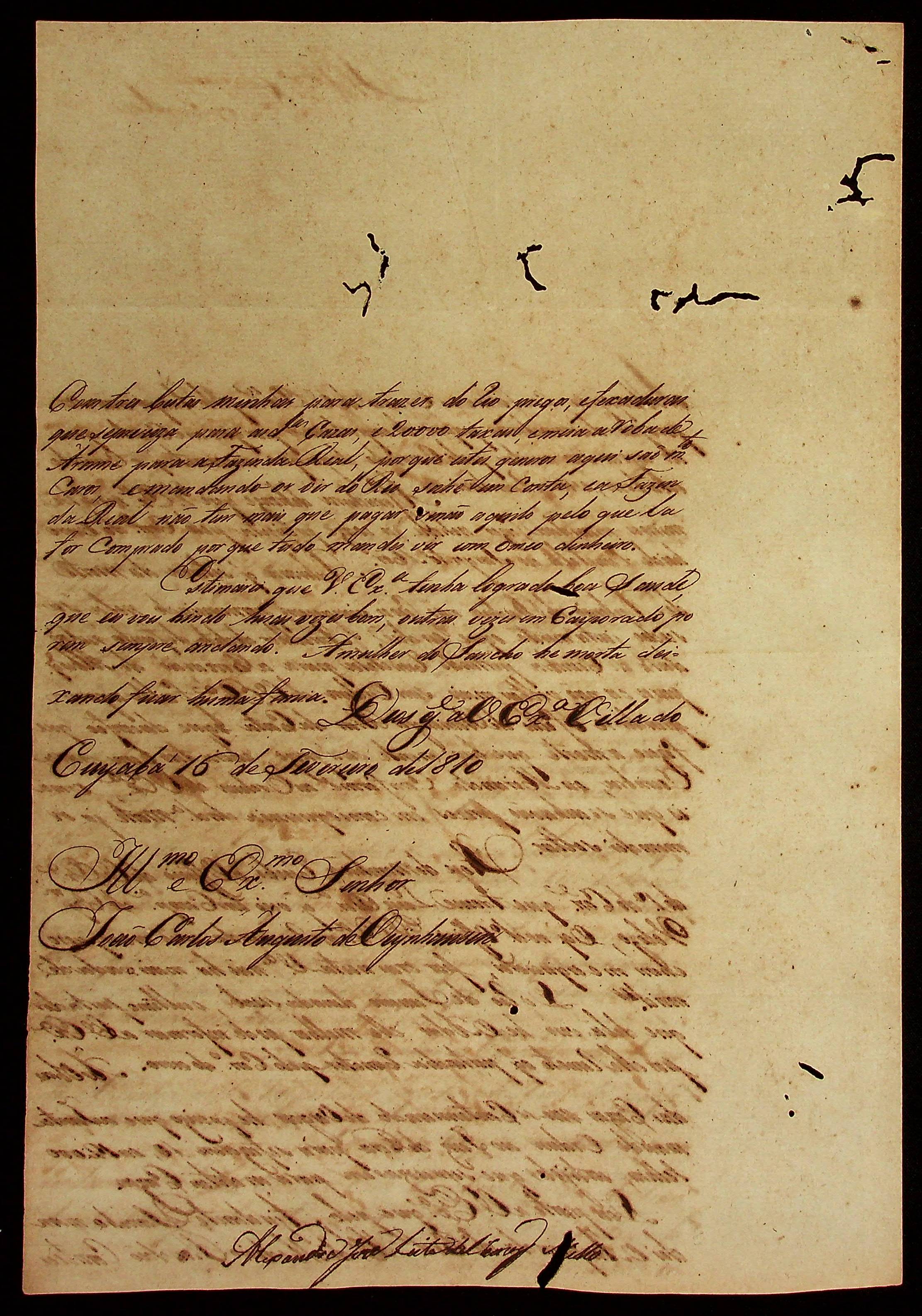 CARTA do [Sargento-mor Ajudante de Ordens] Alexandre José Leite de Chaves Melo ao [Governador e Capitão-General da Capitania de Mato Grosso] João Carlos Augusto d’Oeynhausen e Gravenberg.