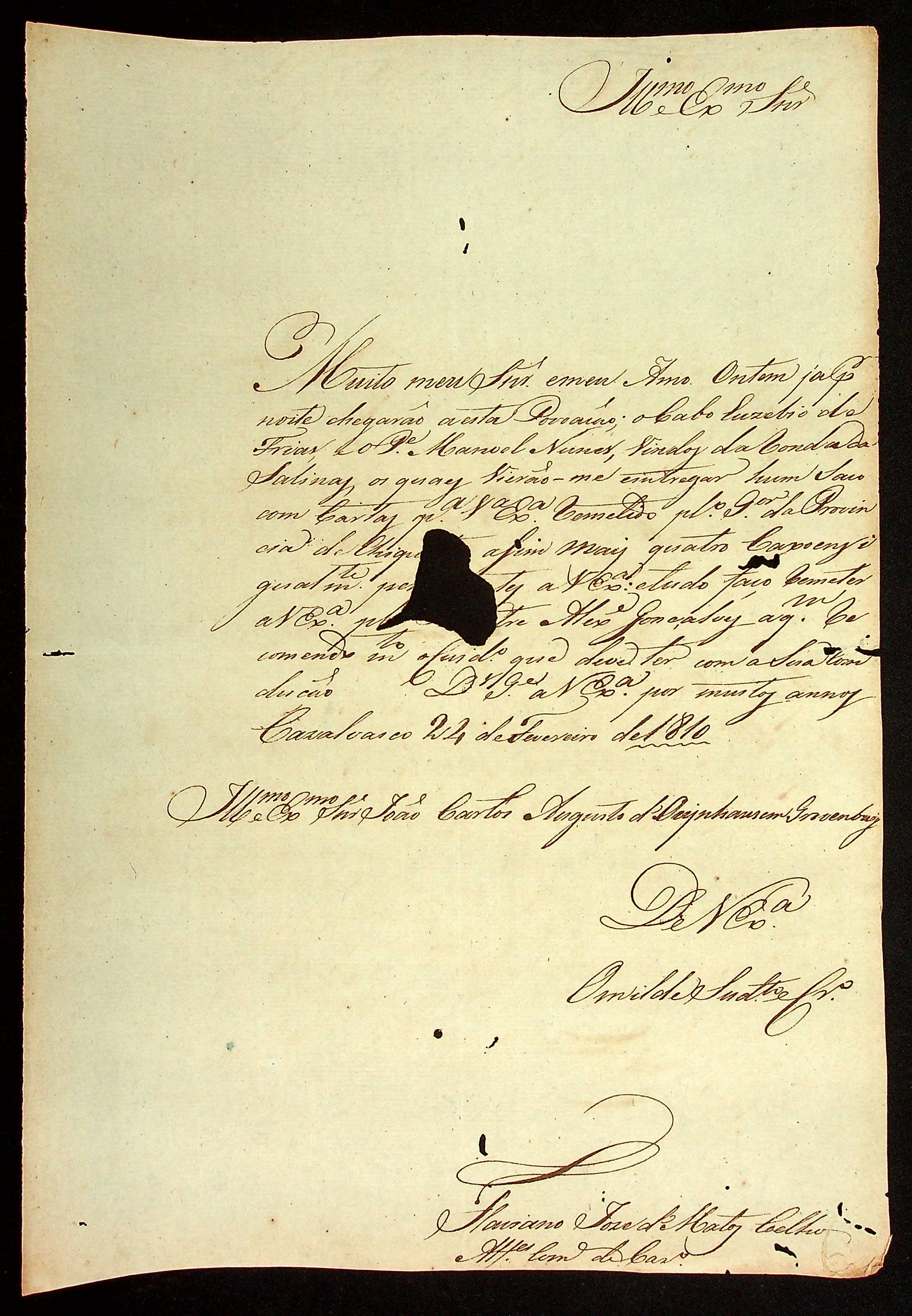 CARTA do [Alferes e Comandante de Casalvasco] Flaviano José de Matos Coelho ao [Governador e Capitão-General da Capitania de Mato Grosso] João Carlos Augusto d’Oeynhausen e Gravenberg.
