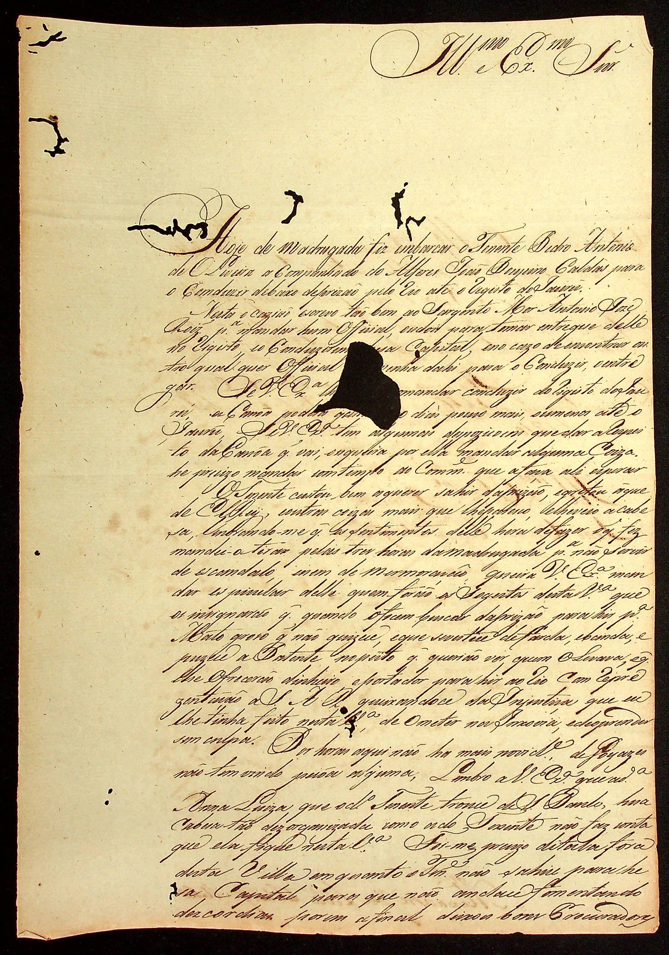 CARTA do [Sargento-mor Ajudante de Ordens] Alexandre José Leite de Chaves Melo ao [Governador e Capitão-General da Capitania de Mato Grosso] João Carlos Augusto d’Oeynhausen e Gravenberg.