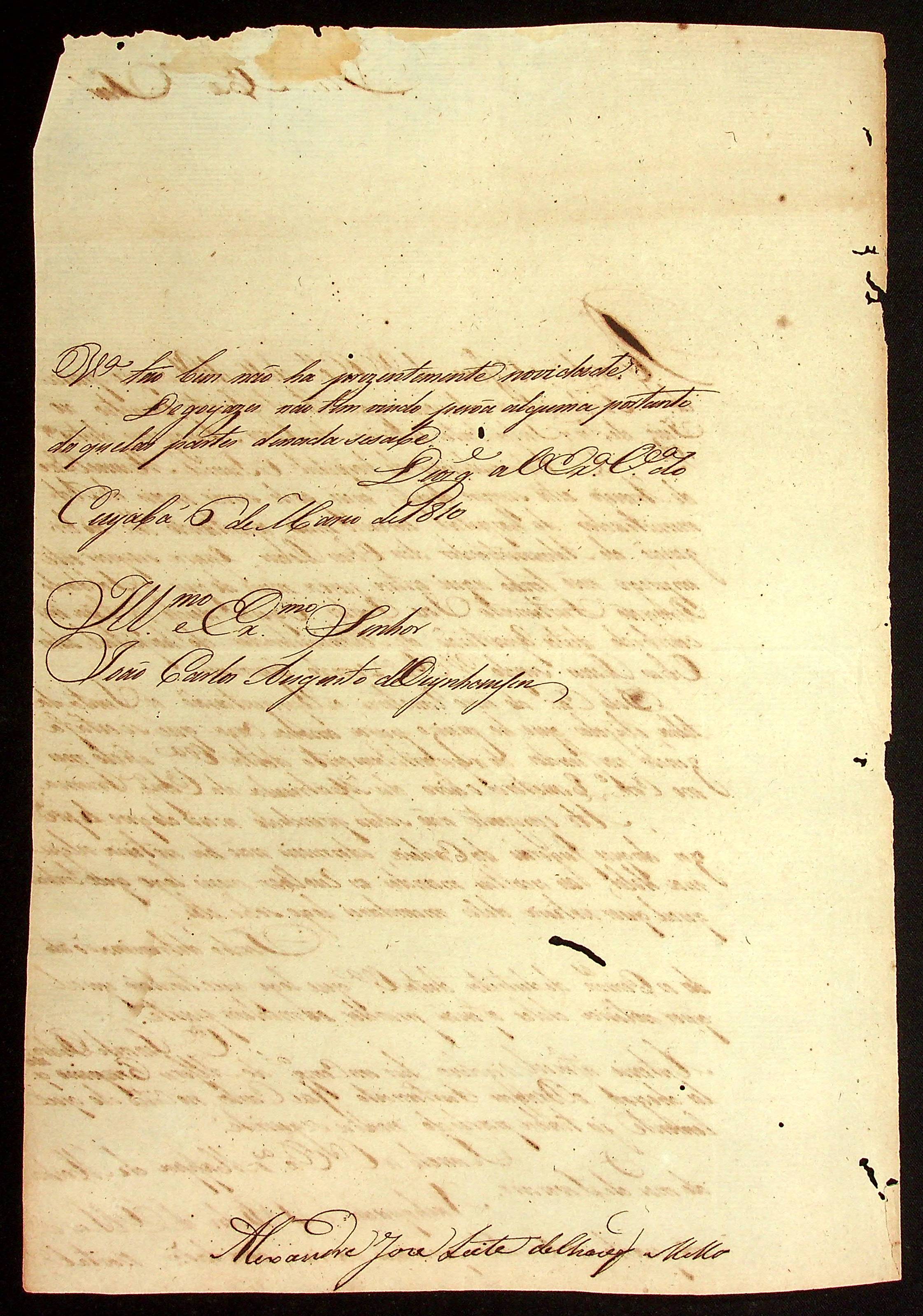 CARTA do [Sargento-mor Ajudante de Ordens] Alexandre José Leite de Chaves Melo ao [Governador e Capitão-General da Capitania de Mato Grosso] João Carlos Augusto d’Oeynhausen e Gravenberg.