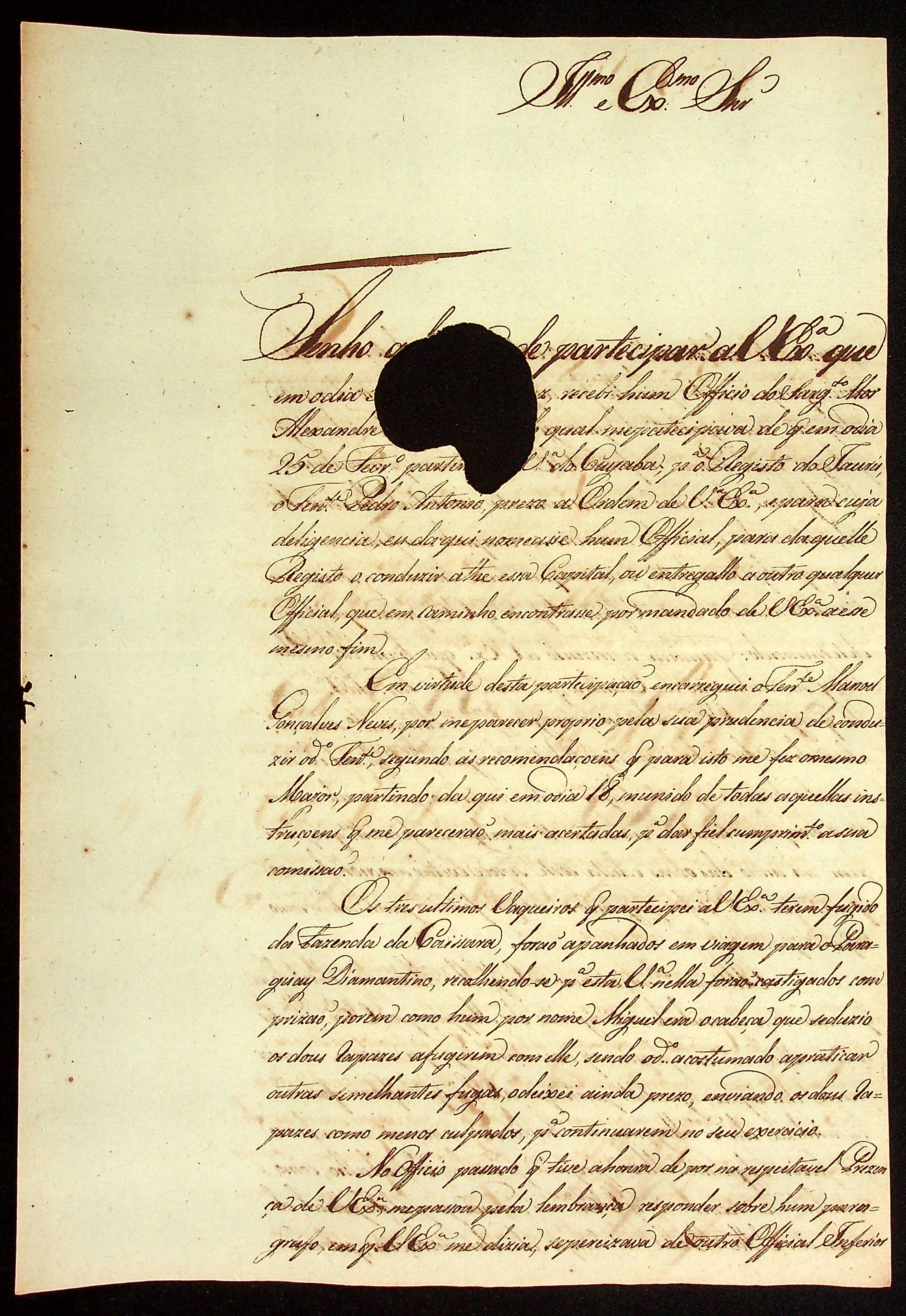 CARTA de Antônio José Rodrigues ao [Governador e Capitão-General da Capitania de Mato Grosso] João Carlos Augusto d’Oeynhausen e Gravenberg.